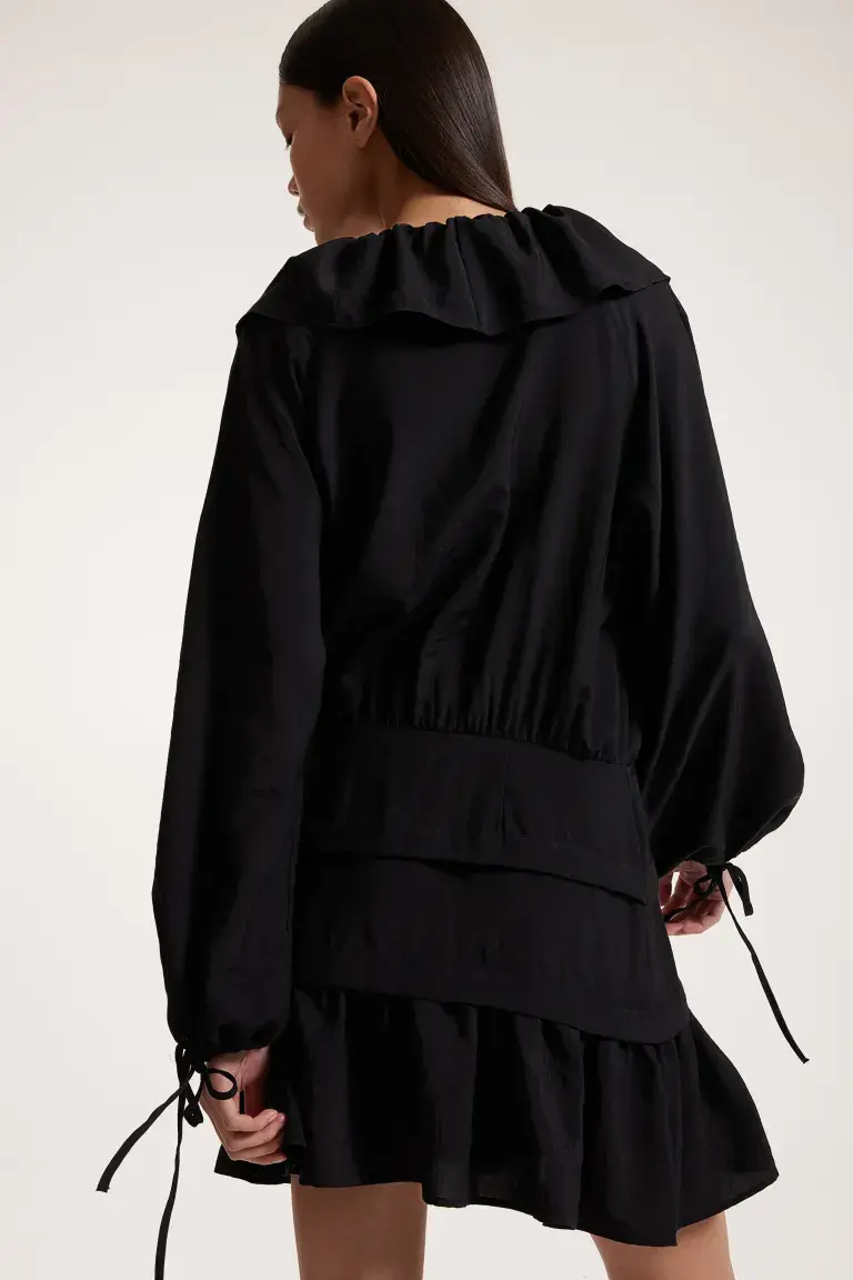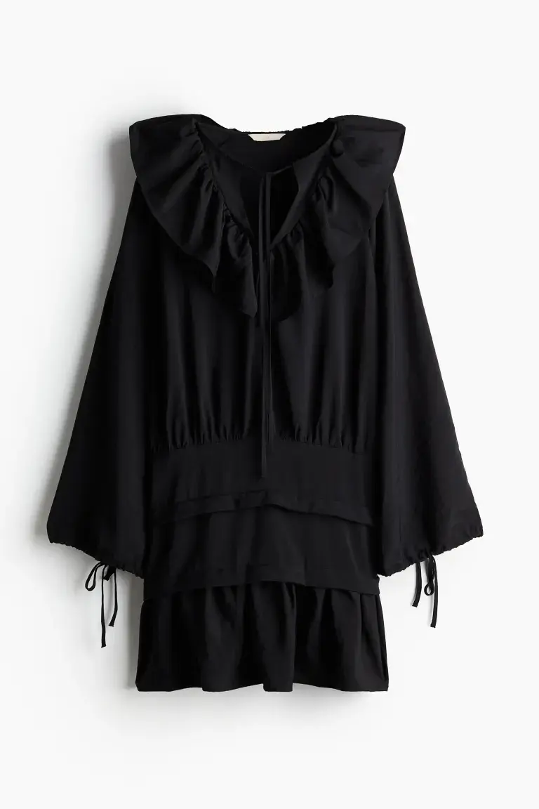 Короткое платье из модальной смесовой ткани. Широкий воротник с воланами и V-образный вырез на узких завязках. Длинные рукава-фонарики кроя реглан с разрезом и узкой кулиской по краю. Отрезная сборка на уровне бедра и расклешенная юбка с широким кантом. Потайная боковая молния. Без подкладки. Размер: Спинка: Длина: 85,0 см (размер M), Рукав: Длина: 75,0 см (размер M) Длина: Короткая Длина рукава: Длинный рукав Посадка: Обычный крой Воротник: волан Вырез: V-образный Фильм рукавов: рукава-фонарики, рукава реглан