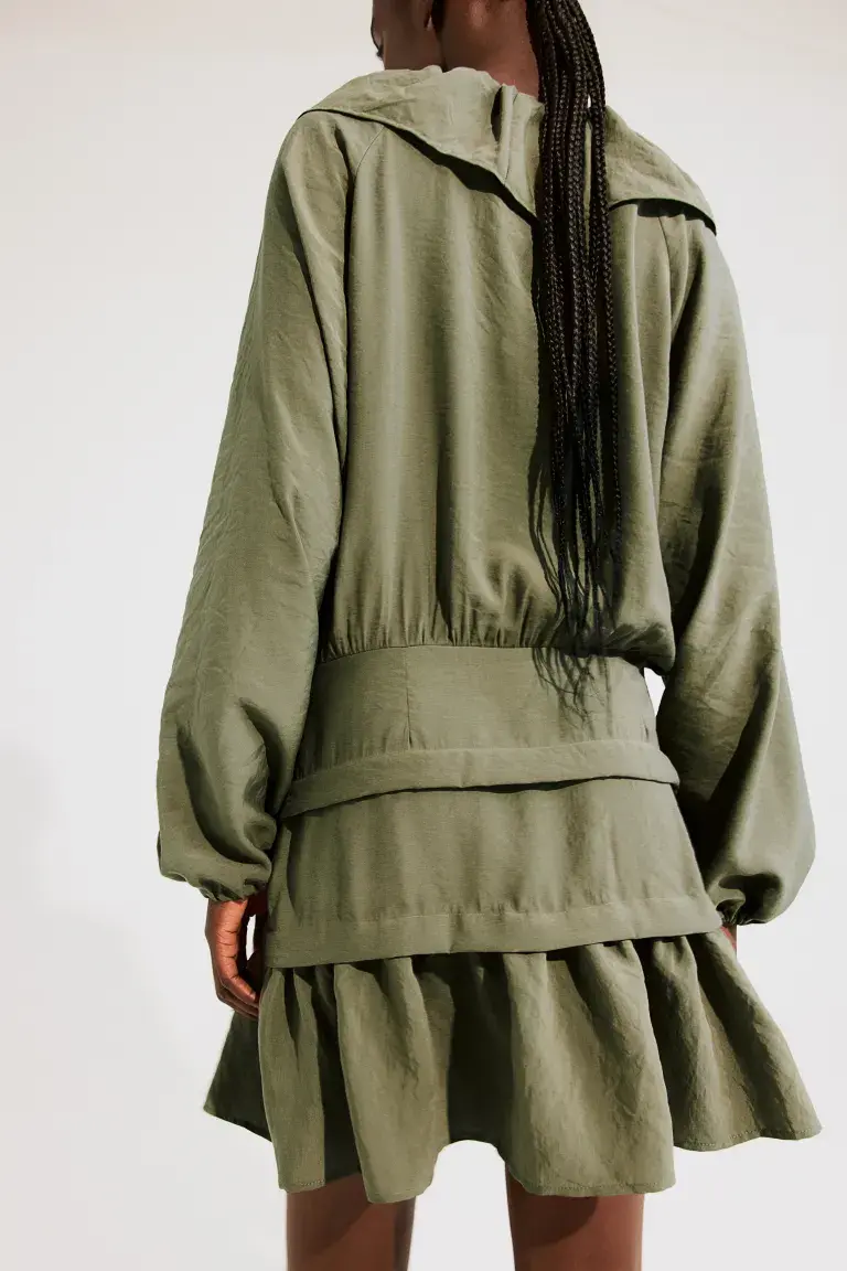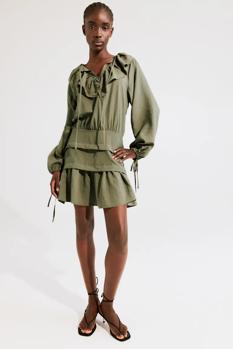 Короткое платье из модальной смесовой ткани. Широкий воротник с воланами и V-образный вырез на узких завязках. Длинные рукава-фонарики кроя реглан с разрезом и узкой кулиской по краю. Отрезная сборка на уровне бедра и расклешенная юбка с широким кантом. Потайная боковая молния. Без подкладки. Размер: Спинка: Длина: 85,0 см (размер M), Рукав: Длина: 75,0 см (размер M) Длина: Короткая Длина рукава: Длинный рукав Посадка: Обычный крой Воротник: волан Вырез: V-образный Фильм рукавов: рукава-фонарики, рукава реглан