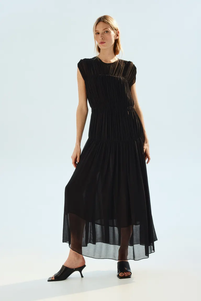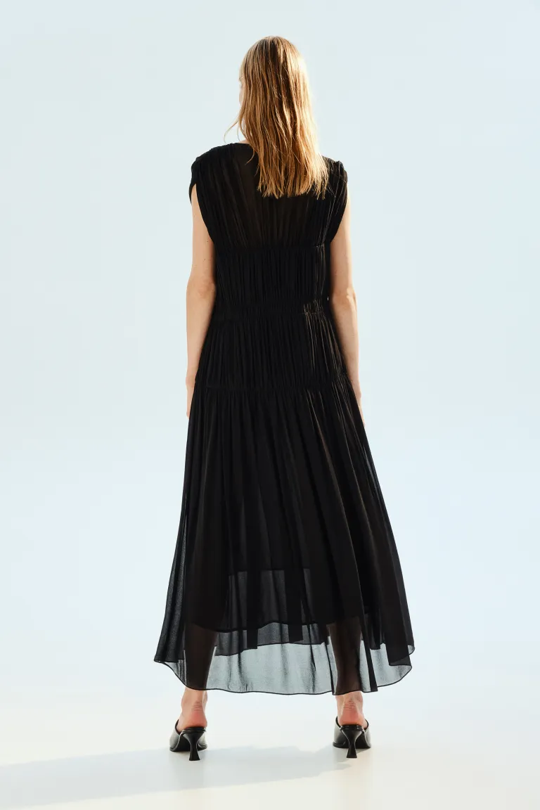 Платье длиной до щиколотки из воздушной вискозной ткани. Свободная посадка. Круглый вырез горловины, вырез на потайной пуговице сзади и объемные рукава. Присборенные швы спереди и сзади для создания эффекта непрерывной драпировки. Частичная подкладка. Размер: Спинка: Длина: 133,0 см (размер M) Длина: Длинная Длина рукава: Без рукавов Посадка: Свободный крой Фильм: Капелька Вырез: Круглый вырез