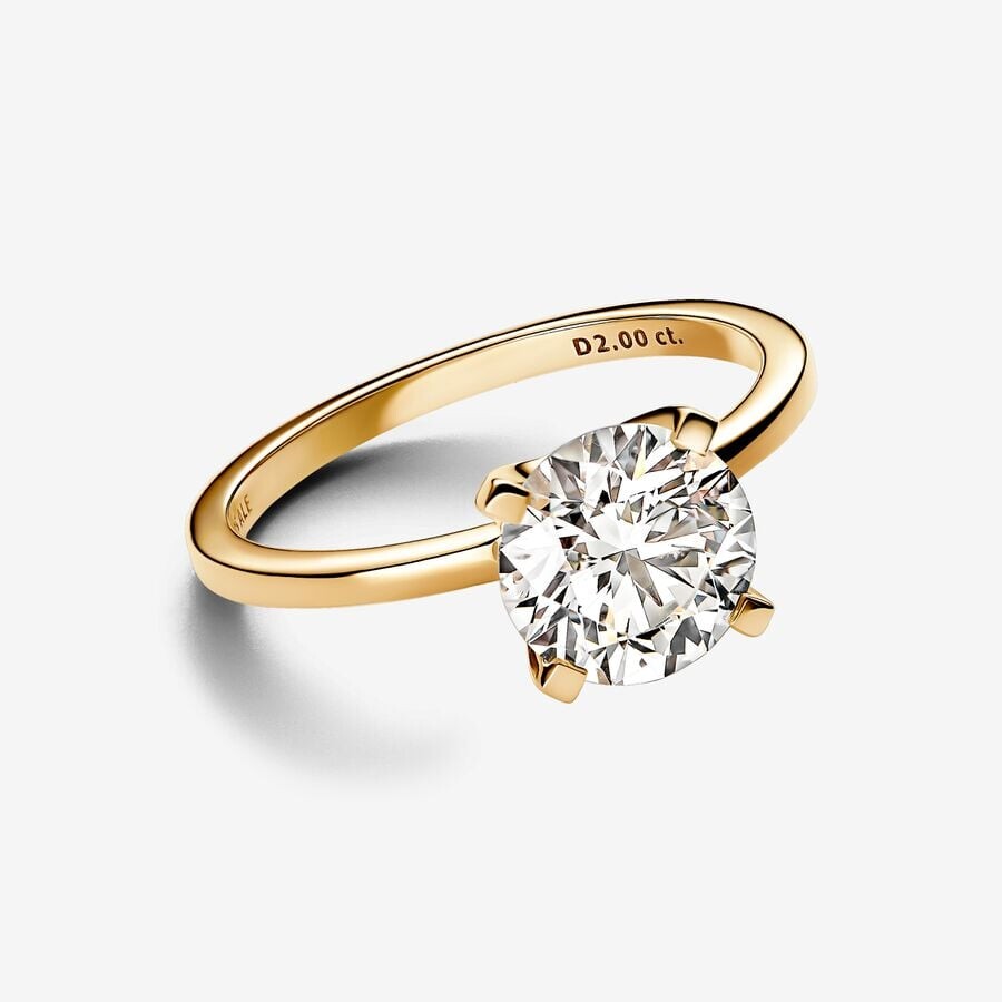 Свежий взгляд на классику. Кольцо Pandora Era из 14-каратного золота с бриллиантом, выращенным в лаборатории, демонстрирует бриллиант круглой превосходной огранки весом 2,00 карата в оправе из четырех зубцов, сочетающей круглый и плоский профили, что создает современную эстетику и открывает камень свету для усиления блеска. Это привлекательное кольцо - предмет, который вы будете носить и ценить долгие годы. Pandora следует стандартам Всемирной ювелирной конфедерации (CIBJO), чтобы гарантировать, что огранка, цвет, чистота и вес в каратах выращенного в лаборатории бриллианта всегда соответствуют или превышают обещанный уровень. Все камни весом 0,50 карат и выше также сертифицированы Международным геммологическим институтом (IGI).