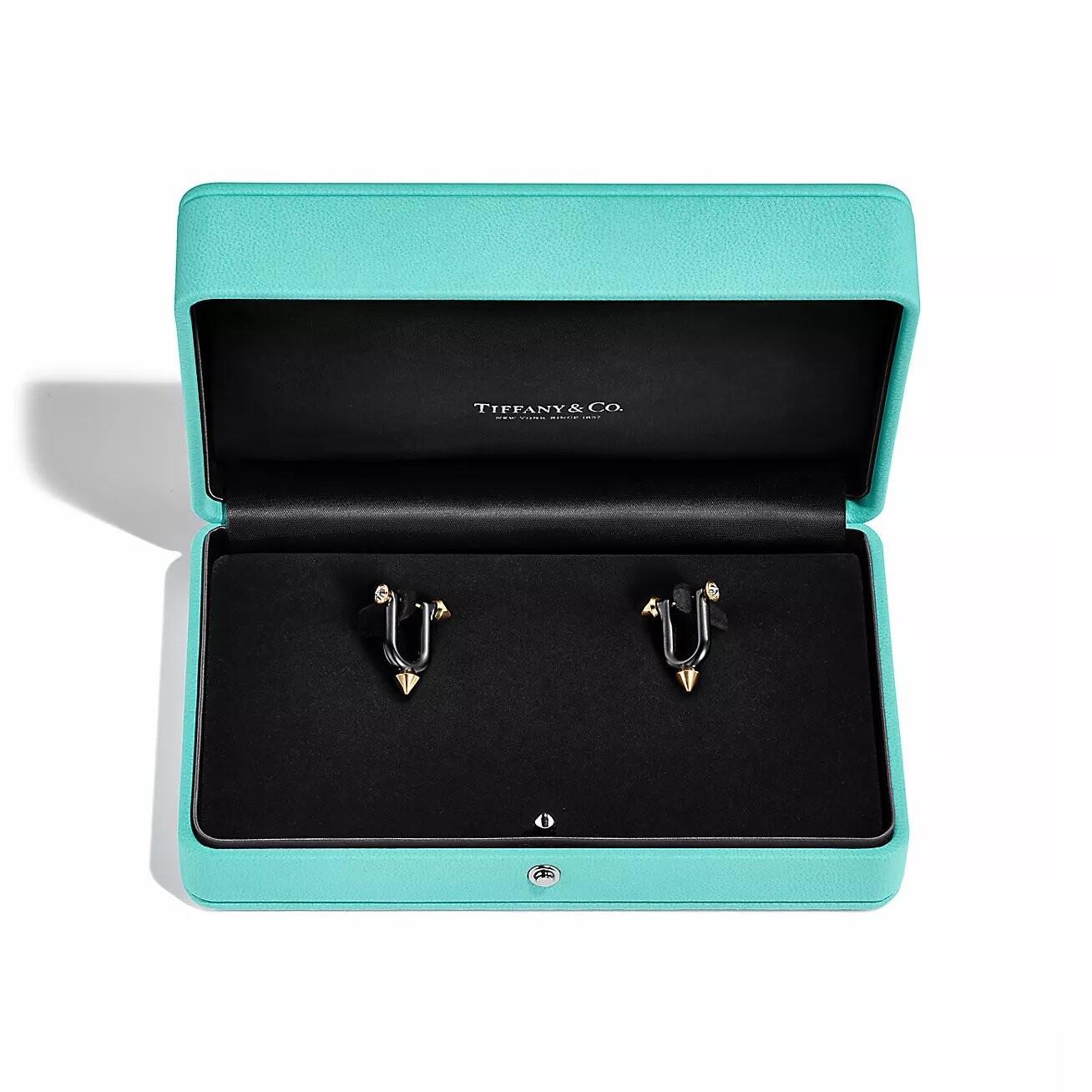 Основанная на традициях сотрудничества ювелирного дома с выдающимися представителями искусства коллекция Tiffany Titan by Pharrell Williams — это выражение бунтарского духа как движущей силы творческого процесса. Вдохновением для этих украшений стал Посейдон с его трезубцем. Остроугольный мотив в форме копья и звенья с яркими очертаниями выполнены из золота 18 карат и титана, создавая поразительный контраст. Французское паве из бриллиантов и обратная закрепка бриллиантов позволяют свету проникать под любым углом, обеспечивая максимальный блеск. Серьги-трансформеры легко превращаются в бриллиантовые пуссеты, создавая поразительный образ.