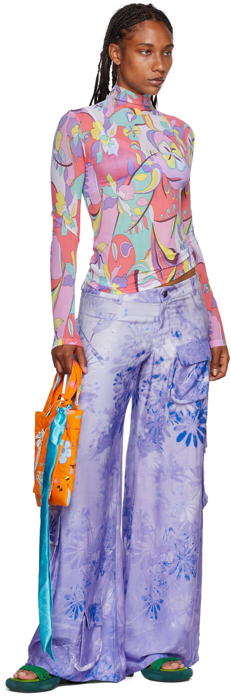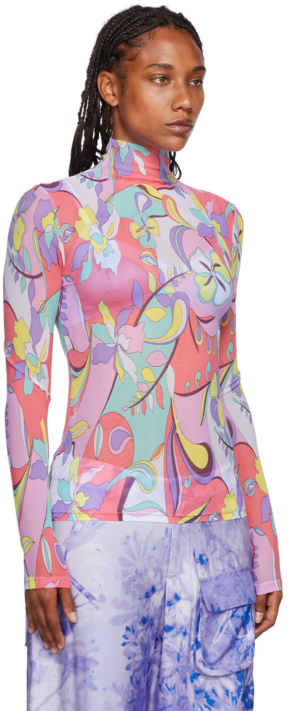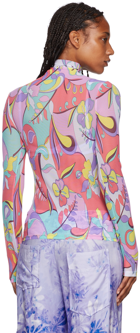 Футболка из эластичной нейлоновой сетки. Цветочные и графические принты по всей поверхности.