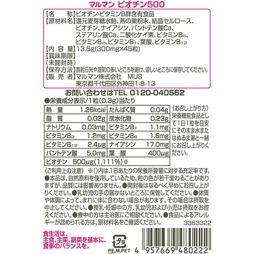Биотин Maruman - это диетическая добавка, содержащая биотин, который является важным витамином группы В. Каждая таблетка содержит 500 мкг биотина, а также другие питательные вещества, такие как ниацин, пантотеновая кислота, витамин В6, витамин В12, фолиевая кислота. Биотин Maruman помогает поддерживать здоровые волосы, кожу и ногти, а также улучшает обмен веществ и поддерживает здоровье нервной системы.