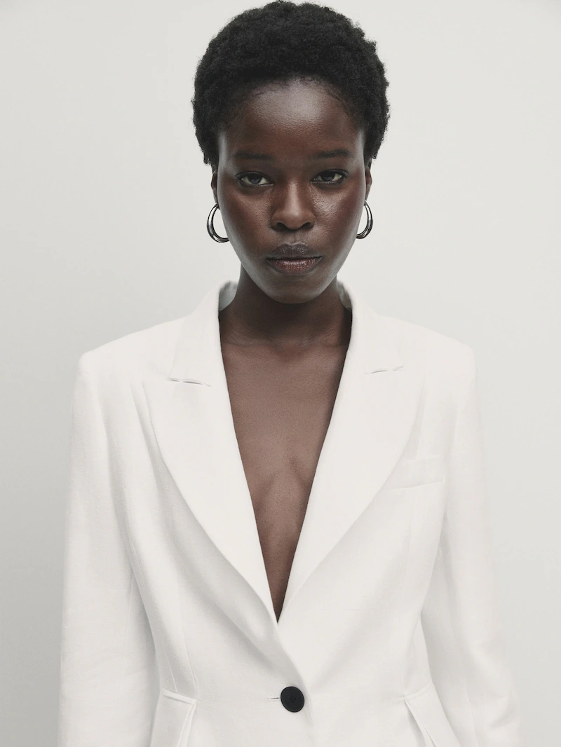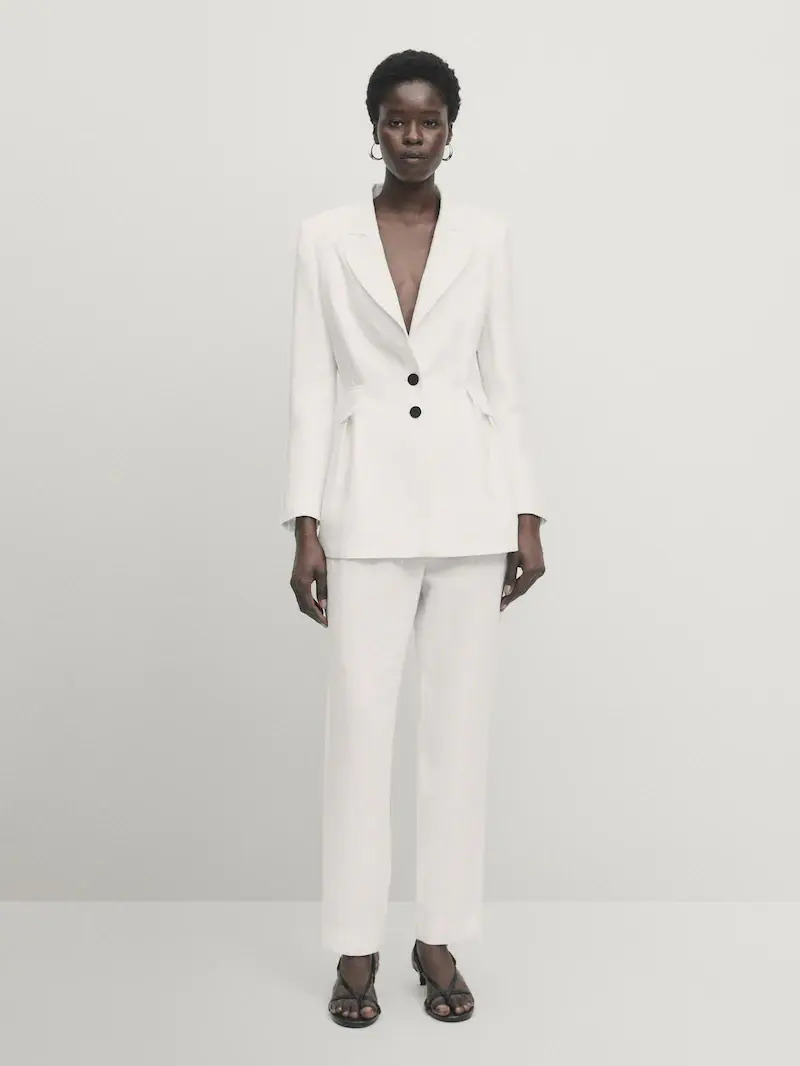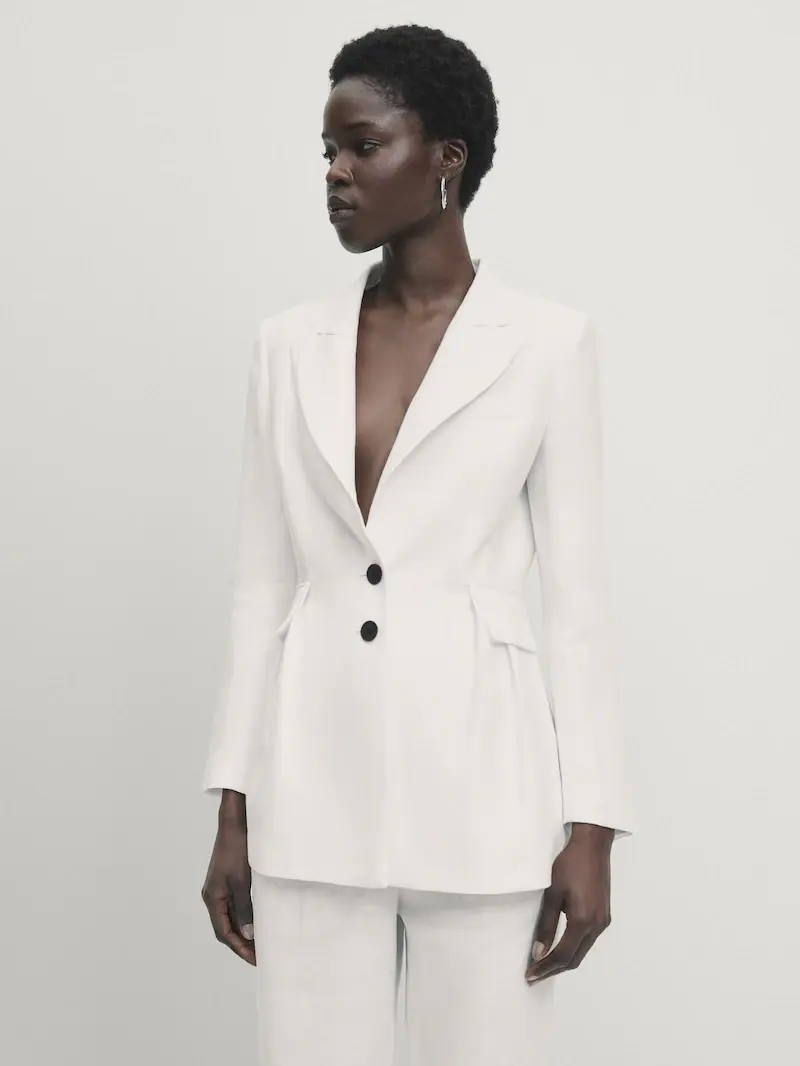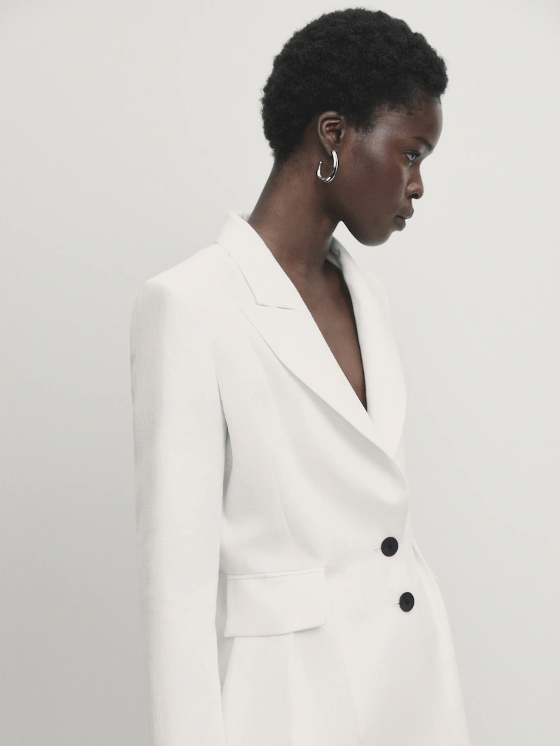 Вытачка спереди. Изготовлен из 100% льна. Воротник с остроконечным лацканом и петлицей. Наплечники. Застежка на две пуговицы. Два кармана с клапанами. Манжеты на пуговицах. На подкладке.