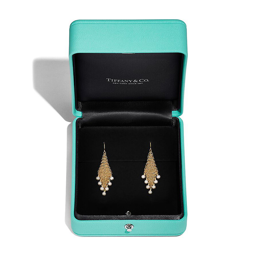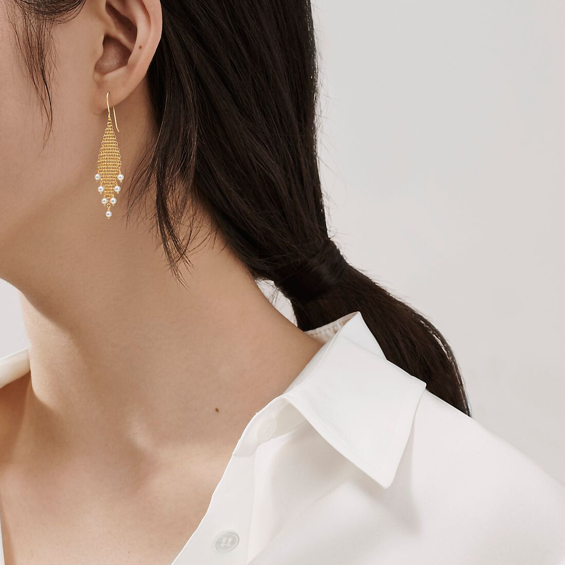 Украшение из тончайшей сетки в точности повторяет контуры тела. Серьги с бахромой из золота, 18 карат, с пресноводным культивированным жемчугом.