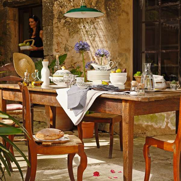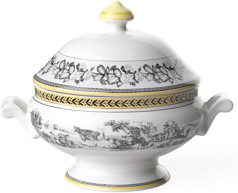 С помощью коллекции Audun бренд Villeroy & Boch изящно соединяет прошлое, настоящее и будущее, вдохновляясь гравюрами на меди, созданными на рубеже прошлого века. Пасторальные сцены в чёрно-белом цвете дополнены акцентной рамкой и подробными принтами. Коллекция Audun состоит из четырёх стилей, таких как Ferme, Promenade, Fleur и Chasse. Все эти стили придадут деревенский колорит любому обеденному столу. Эта супница с крышкой является частью коллекции Audun Ferme в стиле кантри. Черно-белые пасторальные сцены были освежены кремово-желтой акцентной каймой и другими графическими украшениями. В ней идеально подавать первых блюда к столу, они долго останутся горячими.