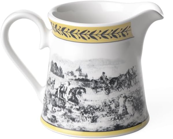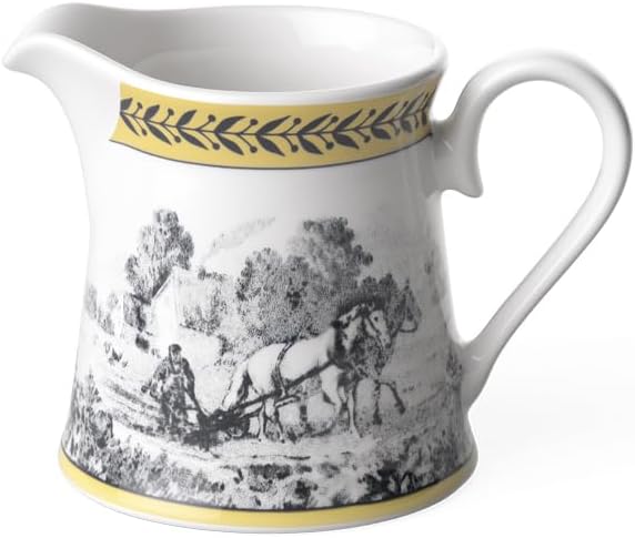 С помощью коллекции Audun бренд Villeroy & Boch изящно соединяет прошлое, настоящее и будущее, вдохновляясь гравюрами на меди, созданными на рубеже прошлого века. Пасторальные сцены в чёрно-белом цвете дополнены акцентной рамкой и подробными принтами. Коллекция Audun состоит из четырёх стилей, таких как Ferme, Promenade, Fleur и Chasse. Все эти стили придадут деревенский колорит любому обеденному столу. Этот молочник является частью коллекции Audun Ferme в стиле кантри. Черно-белые пасторальные сцены были освежены кремово-желтой акцентной каймой и другими графическими украшениями.