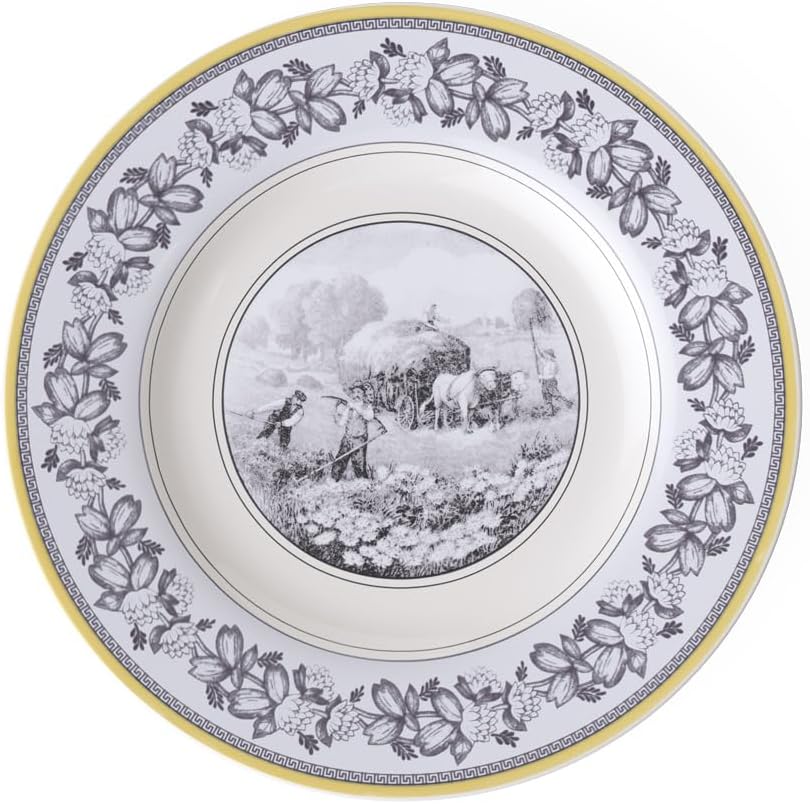 С помощью коллекции Audun бренд Villeroy & Boch изящно соединяет прошлое, настоящее и будущее, вдохновляясь гравюрами на меди, созданными на рубеже прошлого века. Пасторальные сцены в чёрно-белом цвете дополнены акцентной рамкой и подробными принтами. Коллекция Audun состоит из четырёх стилей, таких как Ferme, Promenade, Fleur и Chasse. Все эти стили придадут деревенский колорит любому обеденному столу. Эта тарелка является частью коллекции Audun Ferme в стиле кантри. Черно-белые пасторальные сцены были освежены кремово-желтой акцентной каймой и другими графическими украшениями.