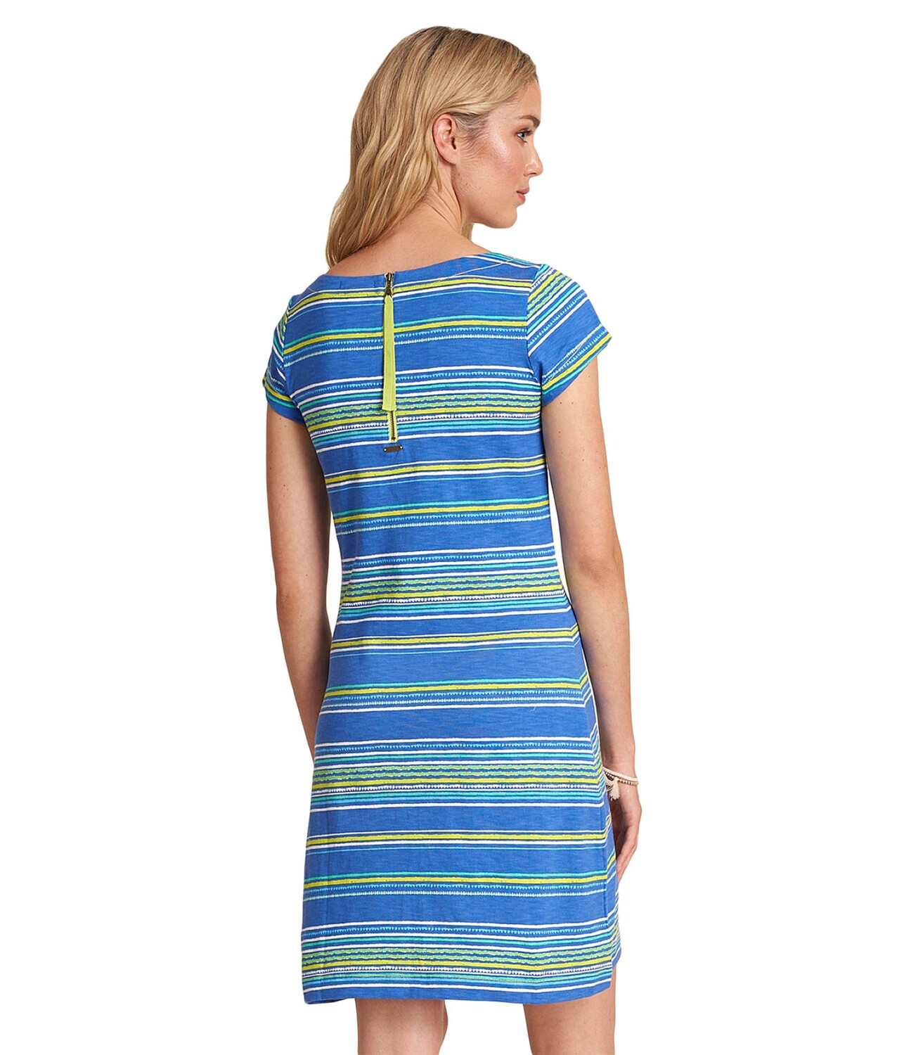 Платье Hatley Nellie выполнено в классическом силуэте в виде футболки с круглым вырезом горловины, короткими рукавами, открытой контрастной планкой на молнии сзади и текстурированным принтом в полоску по всей поверхности. 100% хлопок. Можно стирать в машине. Импортировано.