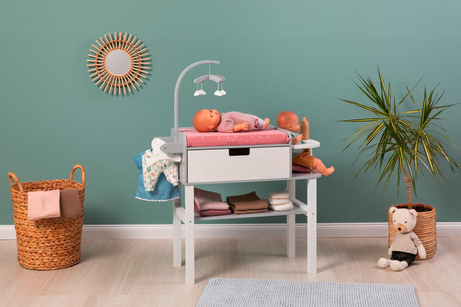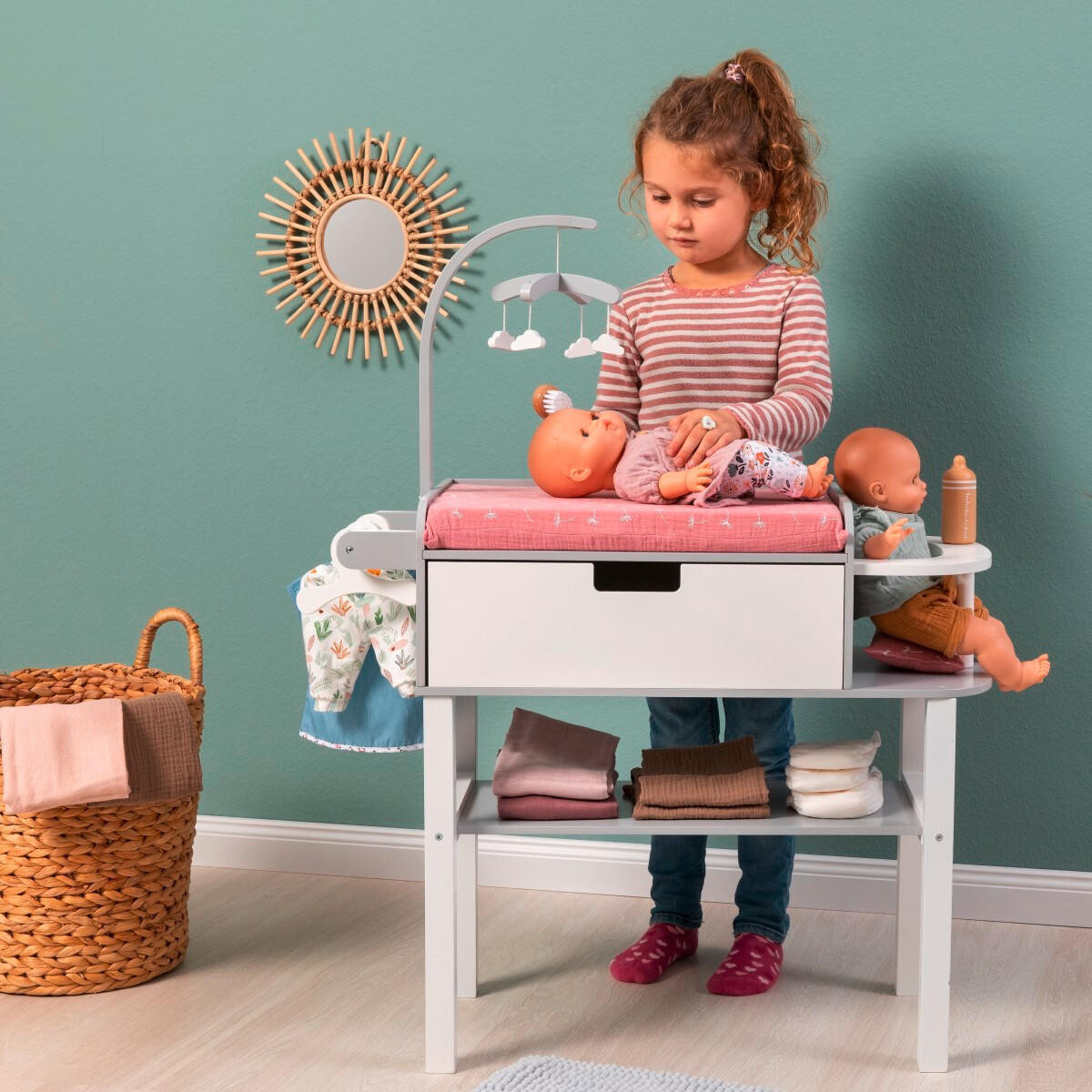 Опытные родители кукол от 3 лет знают, что даже их любимая кукла нуждается в регулярной смене подгузников. И это работает очень хорошо благодаря пеленальному столику для кукол MUSTERKIND «Виола» в белом и сером цвете. Потому что здесь обширное оснащение обеспечивает энтузиазм. Во время «пит-стопа» любимица мамы или папы куклы лежит на мягком пеленальном коврике с чехлом из серой муслиновой ткани, украшенным рисунком одуванчика. Был даже придуман облачный мобильный телефон для отвлечения внимания. Есть практичный большой ящик с функцией стопора для хранения собственного пеленального оборудования. Кроме того, в нижнем отделении достаточно места для кукольной одежды и т. д., чтобы все было под рукой. В цену не входит представленное украшение. Но у универсала есть даже больше: с одной стороны встроен стульчик для кормления, а с другой стороны — вешалка для одежды с 3 вешалками. Пеленальный столик для куклы МЮСТЕРКИНД "Виола" из дерева быстро станет любимой игрушкой вашего малыша.