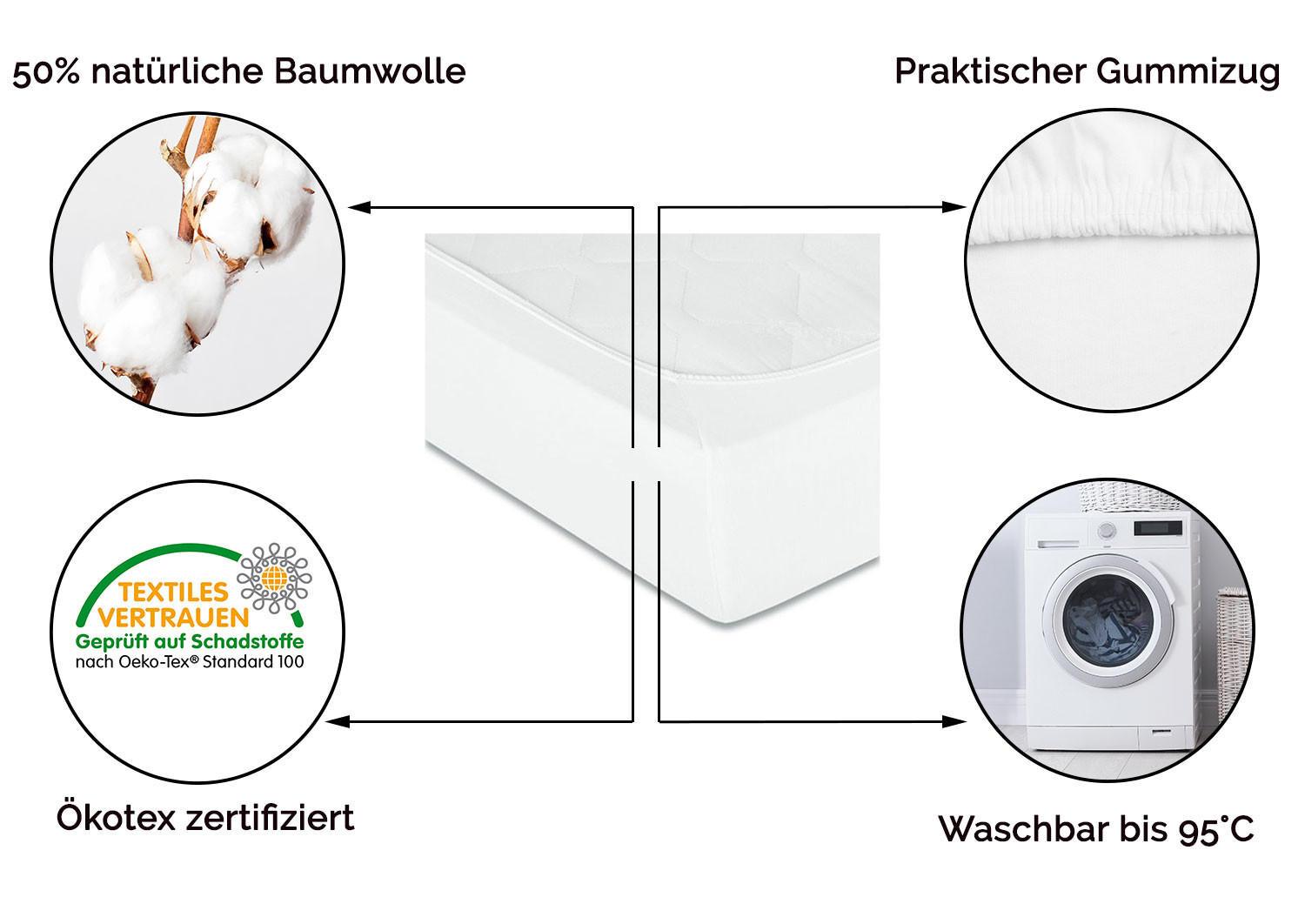 Создайте хорошую основу для спокойного сна с помощью элегантной трикотажной простыни. Прочная, приятная на ощупь простыня из 50 % хлопка и 50 % высококачественного полиэстера впечатляет своими прочными и простыми в уходе свойствами. резинка по всему периметру подходит для матрасов высотой 12-15 см. Подходит для спальни. Благодаря выгодному набору из 2 штук у вас всегда будет что переодеться в шкафу. Простыня чрезвычайно проста в уходе, гигиенична. а также идеально подходит для аллергиков. Его можно стирать при температуре до 95°C, выдерживать кипячение, а также сушить в стиральной машине.