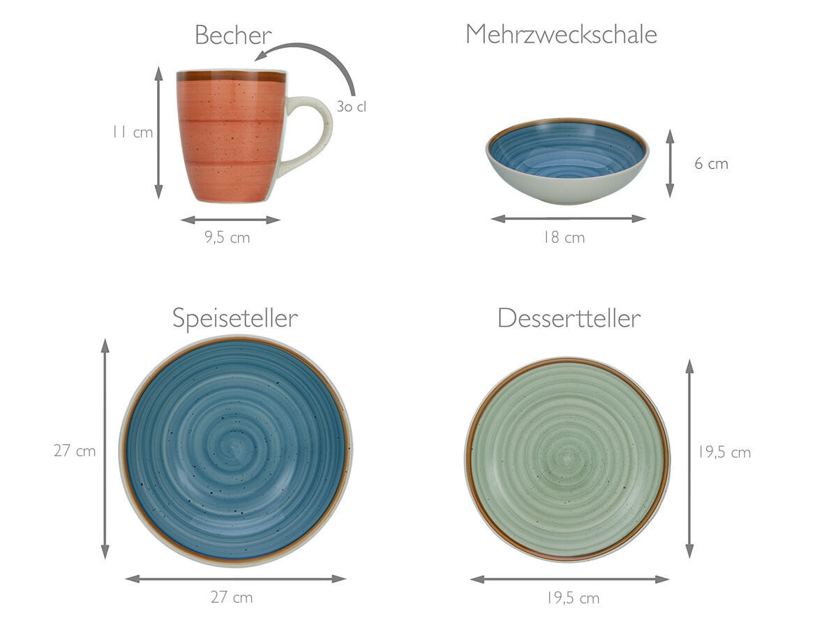 Когда скатерть на месте и декор соответствует кулинарной теме, комбинированный сервиз «Деревенский» из 24 предметов из керамики на 6 персон умело дополняет обеденный стол. Яркие оранжевые, синие и зеленые тона идеально сочетаются с сельскими столами из массива дерева; например, свежесрезанные цветы или небольшие горшки с травами придают свежий вид. Контрастный край элегантно выделяется и придает дизайну изюминку. изысканное прикосновение. Классический круглый дизайн создает спокойный контраст с ярким цветом. Тонкий узор продолжает линии и выглядит динамично. Сервиз впечатляет не только своим шиком, но и высоким качеством исполнения. Тарелки, миски и чашки были расписаны вручную. Особенно практично: все элементы набора безопасны для использования в микроволновой печи. Этот комбинированный керамический сервиз на 6 персон станет стильной вишенкой на торте любого блюда с деревенским шармом. Краткое описание компонентов: ✓ 6 обеденных тарелок (диаметр: ок. 27 см) ✓ 6 десертных тарелок (диаметр: ок. 19,5 см). ) ✓ 6 кофейных кружек (объем: около 300 мл) ✓ 6 мисок для хлопьев