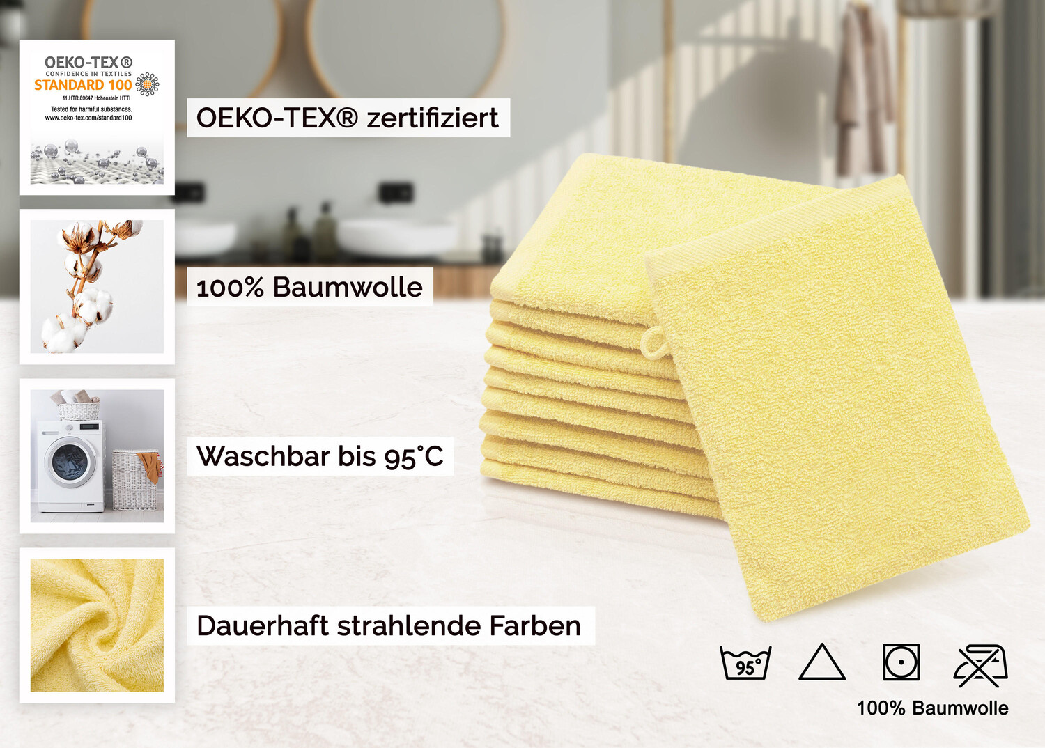 Рукавица для мытья является незаменимой частью любого дома - будь то в классической ванной комнате для утренних процедур, в ванне в качестве игрушки для ваших детей, в уютной гостевой ванной или для маленьких ручек в следующей поездке. Благодаря практичному набору из 10 штук с вешалкой вы будете готовы к любым жизненным ситуациям, потому что мочалок никогда не будет достаточно. Безопасные для кожи салфетки изготовлены из 100% хлопка плотностью около 420 г/м². сотканы из прочной махровой ткани. Эта махровая ткань особенно мягкая и пушистая благодаря характерному ворсу. Для ощущения «как новых» махровые полотенца можно стирать при 95°C, сушить в стиральной машине и, благодаря окраске индантреном, они не теряют своего цвета. Благодаря большому разнообразию цветов, найдется подходящий цвет на любой вкус. Рукавицы для мытья имеют размер 16х21 см и подходят для любой ванной комнаты.