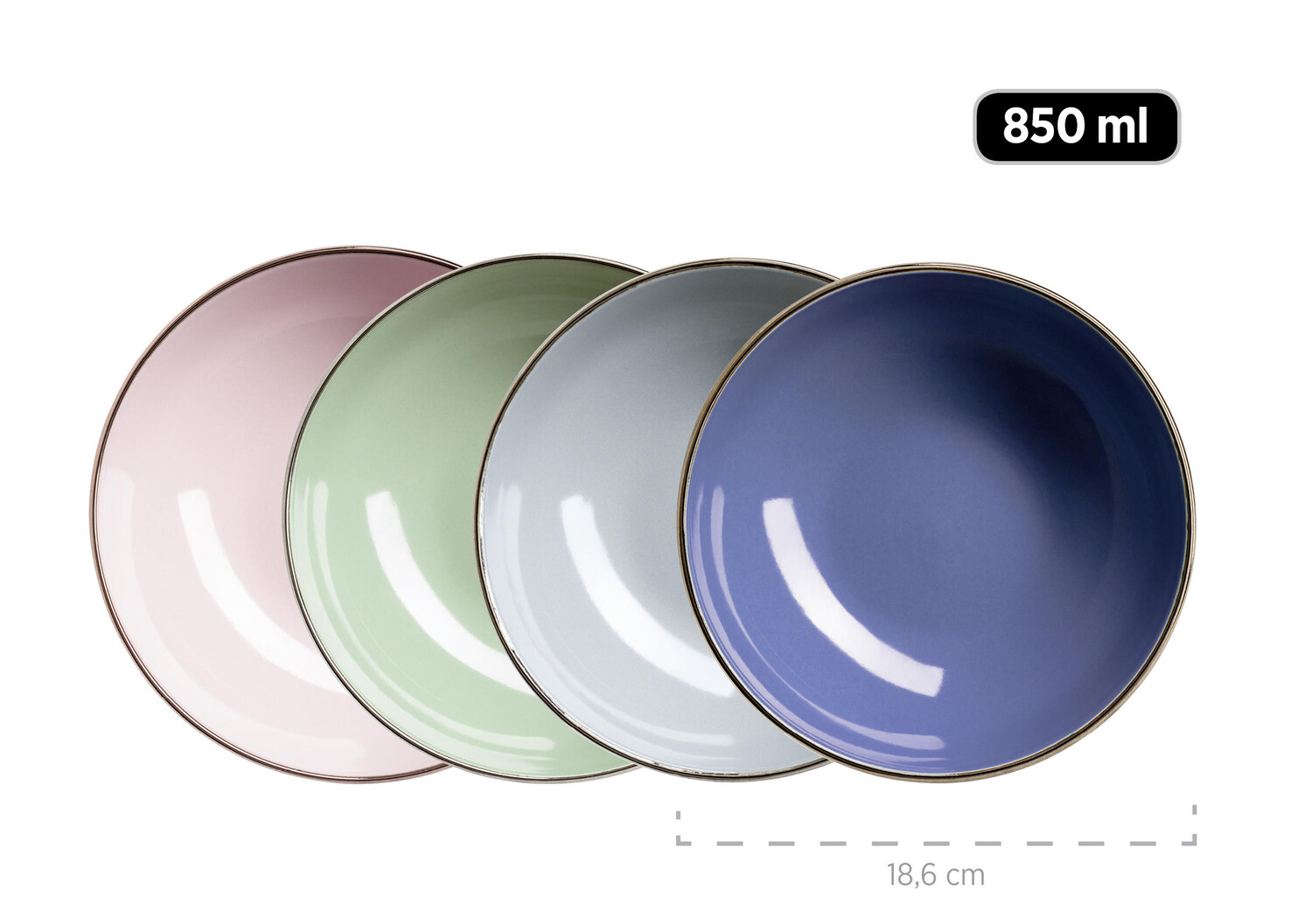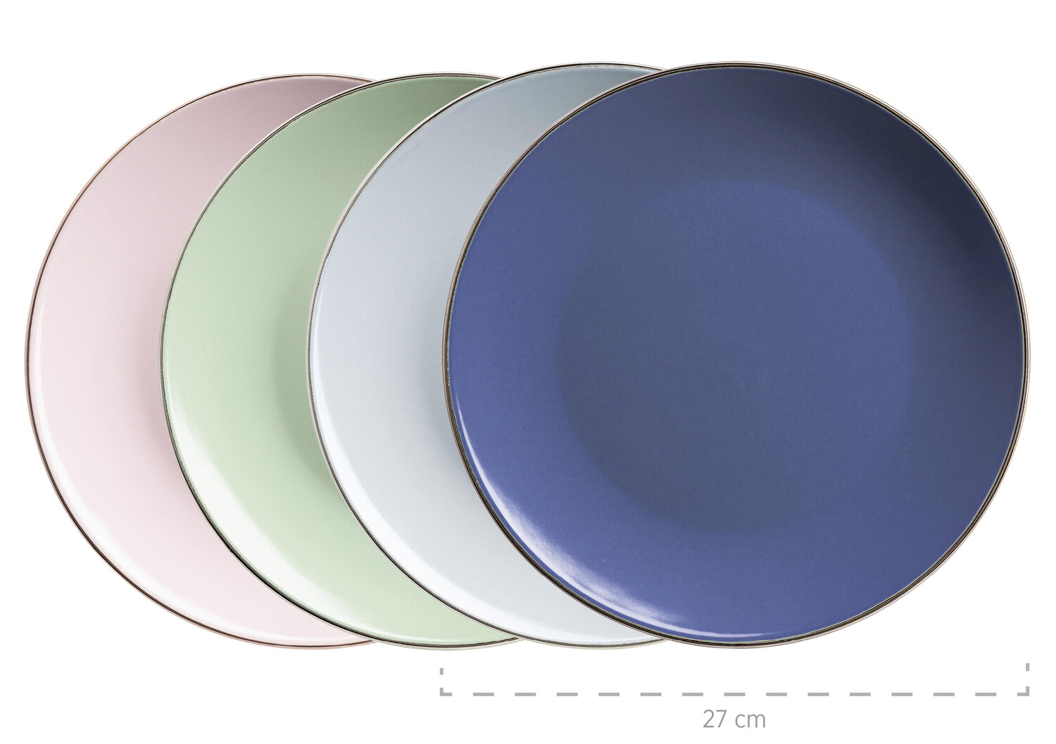 Комбинированный сервиз MÄSER «Metallic Rim» (красочный) привлекает внимание как в повседневной жизни, так и в особых случаях. Для этого высококачественный керамогранит был покрыт блестящей глазурью: голубая, темно-синяя, мятно-зеленая и розовая окраска изысканно подчеркнута серебристыми краями. Ансамбль посуды представляет собой легко комбинируемую изюминку современного обеденного стола. Керамический набор из 16 предметов состоит из 4 десертных тарелок и 4 кружек, которые можно использовать, например, для завтрака или питья кофе. В комплект также входят 4 обеденные тарелки, 4 миски подходят как для супа, так и для мюсли или модных блюд в миске. Комбинированный сервиз MÄSER «Металлический обод» (цветной), пригодный для использования в микроволновой печи, привнесет в дом ультрасовременный гламур. ВНИМАНИЕ: в глазури могут возникнуть небольшие неровности, небольшие включения и минимальные отклонения цвета.