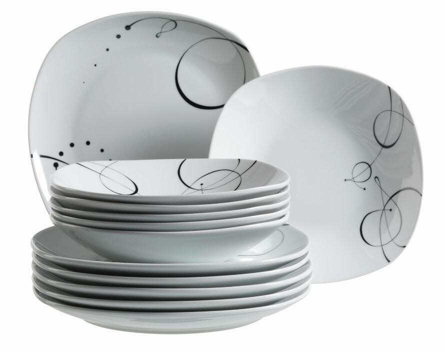Обеденный сервиз MÄSER «Шансон» (12 предметов) придаст живость вашему обеденному столу. Белый фарфор украшен игривым узором из тонких черных линий, что придает посуде стильную современность. Серия гармонирует как с изысканным декором стола, так и с романтическим цветочным декором - по вашему вкусу. Ансамбль включает в себя оборудование примерно на 6 человек с обеденными и суповыми тарелками - здесь ваши сладкие или соленые кулинарные творения проявляются. Украсьте свою кухню шикарным обеденным сервизом MÄSER «Шансон» (12 предметов). Дополнительные преимущества продукта: современная, слегка квадратная форма, можно использовать в микроволновой печи. Диаметр обеденной тарелки: ок. 25 см. Диаметр суповой тарелки: ок.