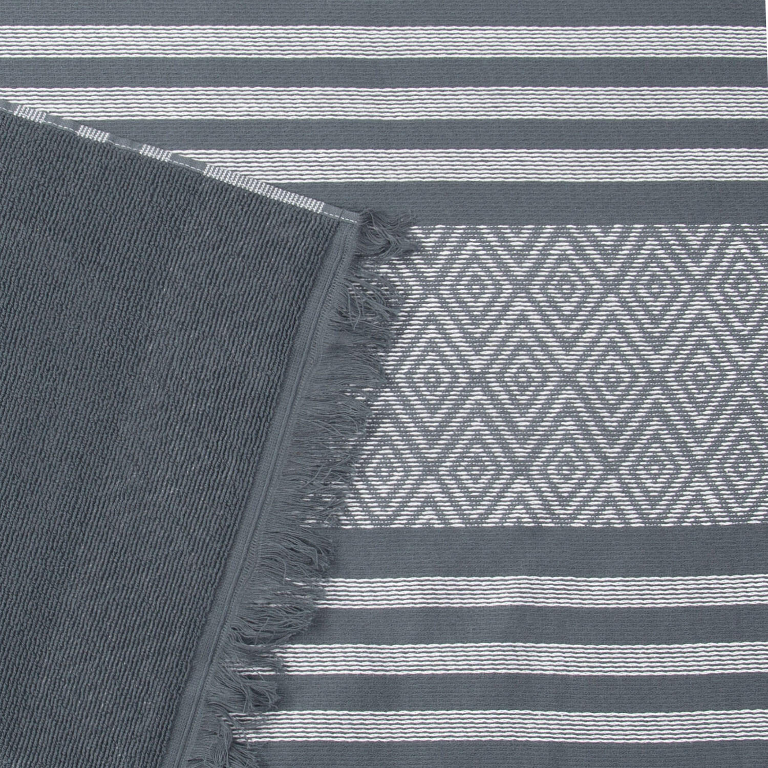 Это пляжное полотенце не оставляет желать лучшего! Он не только особенно красив, но также прочен и впитывает влагу. Одна сторона гладкая, похожа на полотенце для хаммама, другая – из мягкой крученой махры. Поэтому он еще лучше впитывает влагу. Безопасное для кожи банное полотенце изготовлено из 100% хлопка. Модное сочетание полосок и ромбовидных узоров антрацитового и белого цветов делает его шикарным пляжным аксессуаром с привлекательной гарантией. Легкое в уходе пляжное полотенце можно стирать при температуре 40°C, а затем помещать в сушилку при низкой температуре. . При первой стирке ткань с бахромой рекомендуется стирать отдельно. Благодаря весу материала 350 г/м2 простыня очень впитывает влагу, но при этом быстро сохнет и легка. Поскольку качество и безопасность очень важны для бренда ZOLLNER, махровое полотенце было протестировано на наличие вредных веществ и сертифицировано по стандарту СТАНДАРТ 100 от OEKO-TEX - номер теста 70367 OETI.