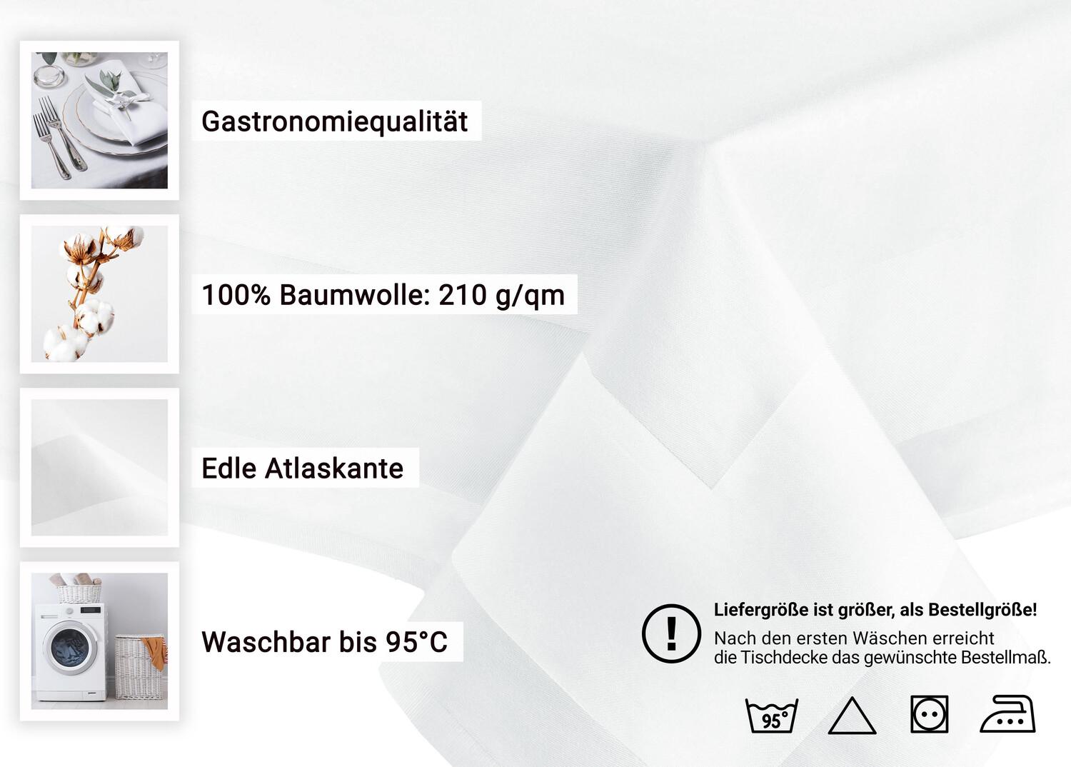 Высокое качество и вневременная красота! С помощью этих элегантных скатертей вы сможете в кратчайшие сроки создать стильно накрытый стол. Элегантный атласный край по всему периметру украшает эти шикарные скатерти и украсит любую обстановку. Ткань приобретает шелковистый блеск благодаря специальной обработке во время производства, благодаря чему ткани блестят еще ярче. В этом процессе скатерти размером 160х160 см ткутся из цельнослойной пряжи и мерсеризуются. Полная нить делает ткань еще более прочной. Прочные и простые в уходе скатерти имеют плотность материала около 210 г/м² и изготовлены из 100% хлопка. Их можно стирать при температуре до 95°C и сушить в стиральной машине. Даже после нескольких стирок и глажки они не теряют блеска и прочности материала. Разрешены любые виды отбеливания, а также возможна глажка при высоких температурах. Это элегантное столовое белье представляет собой простую классику и доступно в различных размерах.