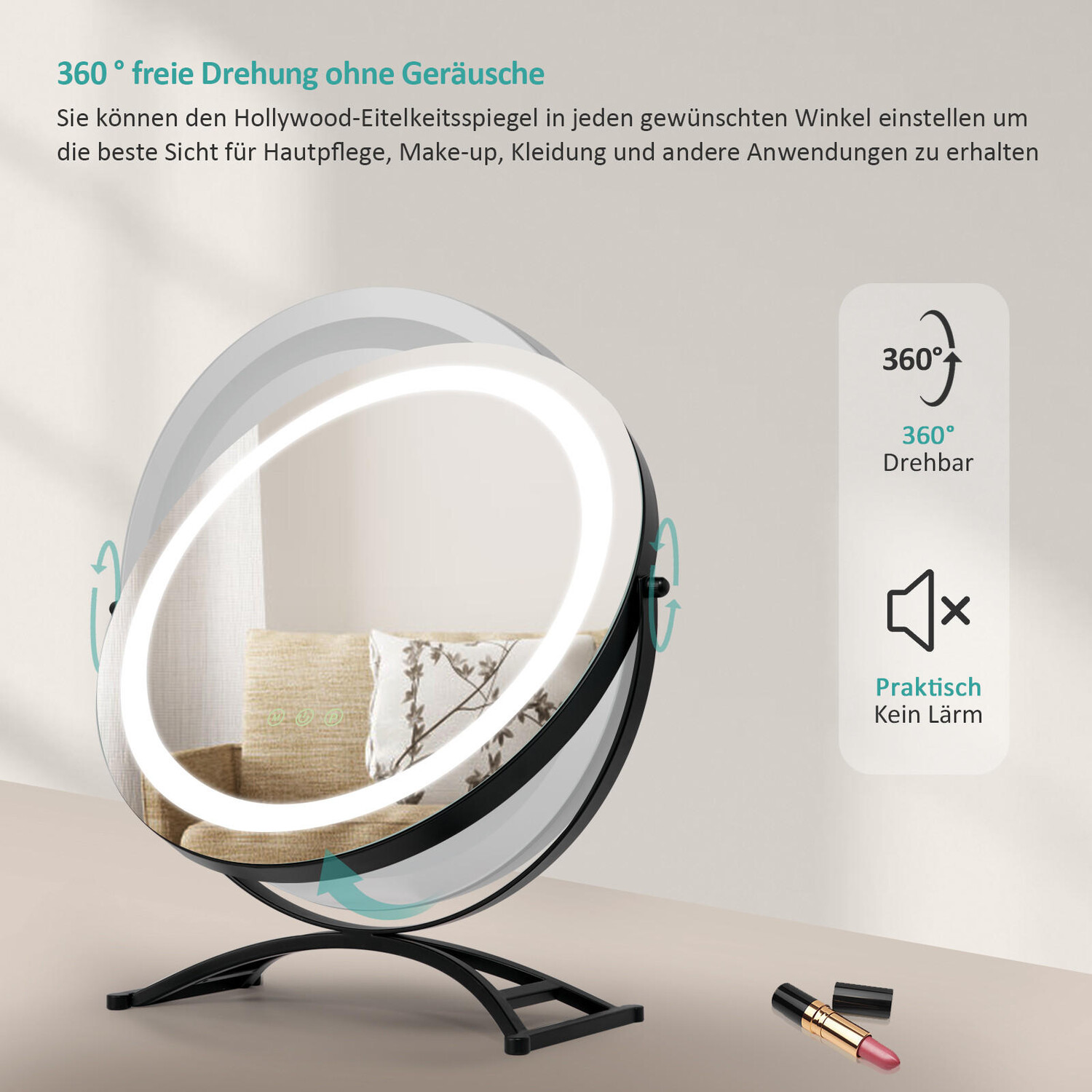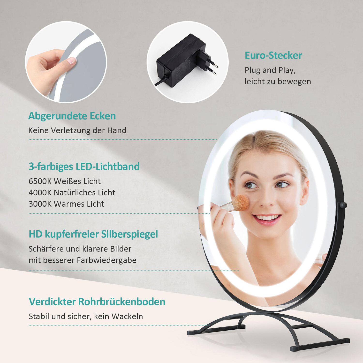 Косметическое зеркало EMKE «CM07» с подсветкой, 3 цвета света, диммер, функция памяти. Описание товара: Косметическое зеркало черного цвета, диаметр зеркала 40 см, толщина 28 мм. Размер основания зеркала 32 x 16 см. Зеркало: прочный железный держатель обеспечивает высокую устойчивость, а нижняя часть имеет нескользящую подкладку. Это эффективно предотвращает случайное соскальзывание зеркала со стола или опрокидывание. Вращение на 360°: зеркало можно гибко регулировать под нужным углом в соответствии с вашими индивидуальными потребностями. Это идеальный компаньон для вашей укладки, макияжа и ухода за кожей. 3 цвета подсветки: всего одним касанием вы можете настроить цвет подсветки зеркала в соответствии со своими предпочтениями. Вы можете выбрать правильный цвет света (3000/4000/6500K) в зависимости от освещения в комнате. Регулируемая яркость: цвет и яркость света регулируются. Регулировать яркость зеркала можно всего одним нажатием кнопки. Во время нанесения макияжа вы можете увеличить яркость, а хотите сэкономить энергию — уменьшить. Функция памяти: зеркало для макияжа имеет функцию памяти, которая сохраняет все настройки перед выключением устройства. Это автоматически восстановит последний использованный режим при следующем включении.