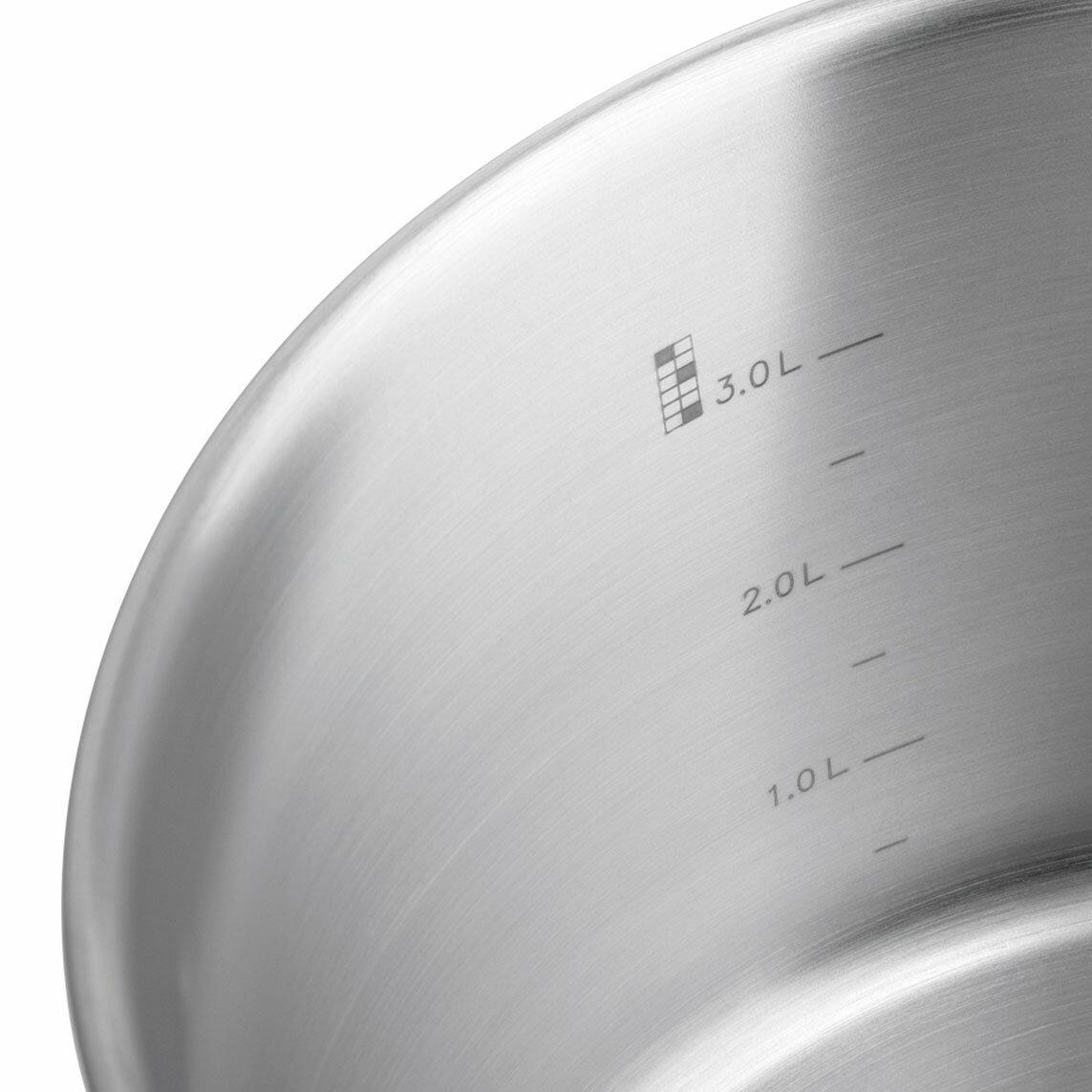 Кастрюля имеет диаметр 20 см и плотно закрывающуюся крышку, что позволяет готовить с минимальным использованием воды. Подходит для любого типа плиты, включая индукционные плиты и духовку. Его ручки остаются приятно прохладными во время использования, а загнутый край что предотвращает капание, помогает при наливании. Встроенная шкала наполнения также удобна и упрощает дозировку жидкостей.