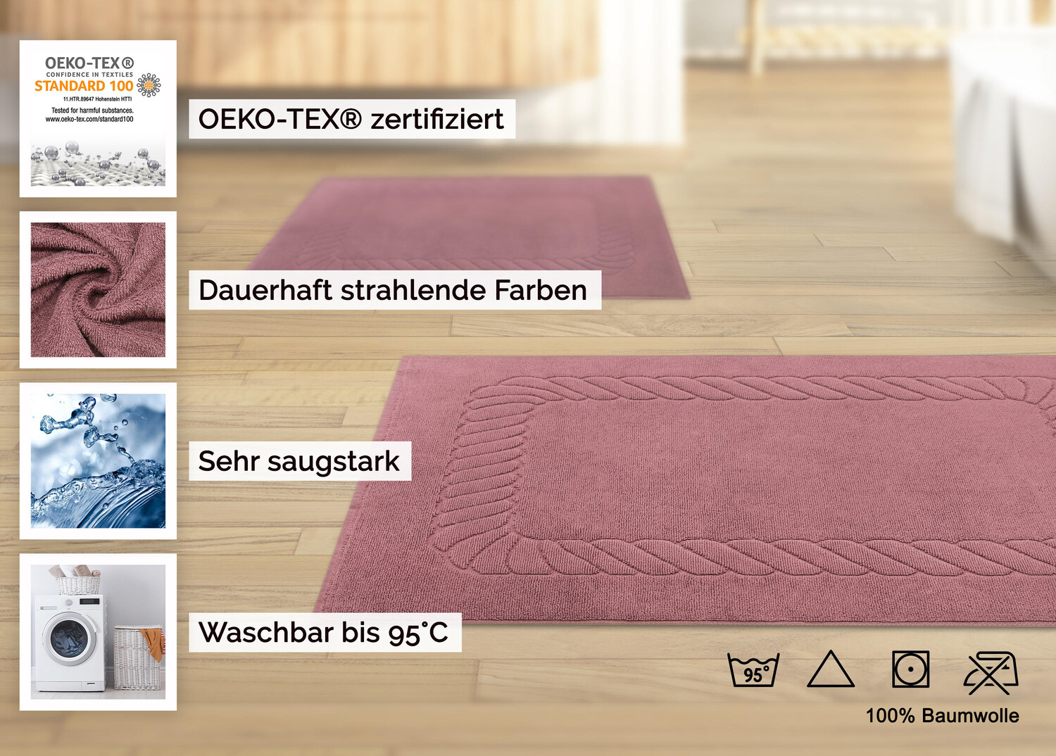 Дополнительный комфорт для вашей ванной комнаты: с этим ковриком для ванной ваши ноги снова будут сухими сразу после теплого душа или расслабляющей ванны. При зимних температурах они также подходят в качестве небольших полозьев перед раковиной или перед унитазом, чтобы ваши ноги были в тепле. Уютные коврики для ванной размером 50x70 см имеют вес материала 740 г/кв.м и имеют двойную безопасность. шов по продольным швам. Они изготовлены из 100% хлопка, переработанного в крученую махровую ткань. Это придает коврику для ванны старого розового цвета приятную массажную функцию и делает его чрезвычайно впитывающим, что идеально подходит для только что вымытых ног. Прочные коврики для ванной также впечатляют элегантным узором в виде кос и прекрасным выбором цветов. Индантреновое окрашивание предотвращает вымывание ярких цветов. Поэтому прочный хлопковый коврик можно стирать при температуре 95°C и сушить в стиральной машине.