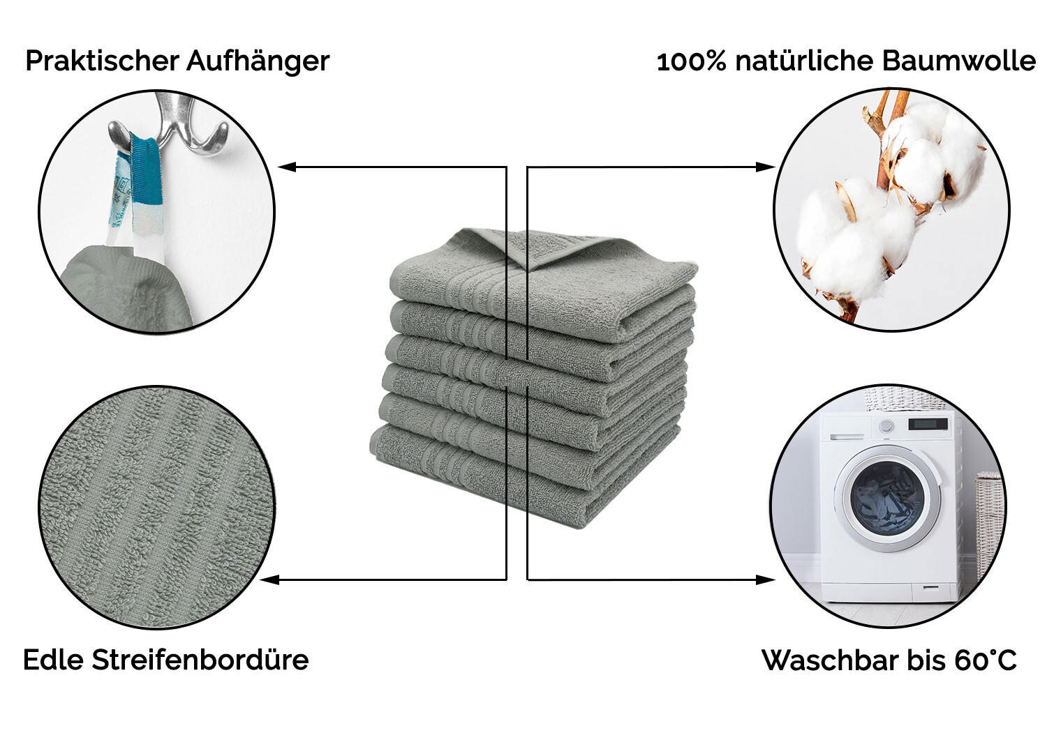 В наборе из 6 практичных полотенец для гостей вы получите чрезвычайно красивую и пушистую походную посуду. Мыльные полотенца изготовлены из 100% высококачественного хлопка, очень впитывают влагу и очень долговечны благодаря хорошему качеству изготовления. Белые полотенца можно стирать при температуре до 95°C, а цветные — до 60°C. Их вес составляет около 380 г/м². Красивые глубокие полосы на гладкой поверхности придадут вашей ванной комнате элегантный вид. Вашим посетителям понравятся гостевые полотенца размером примерно 40х60 см.