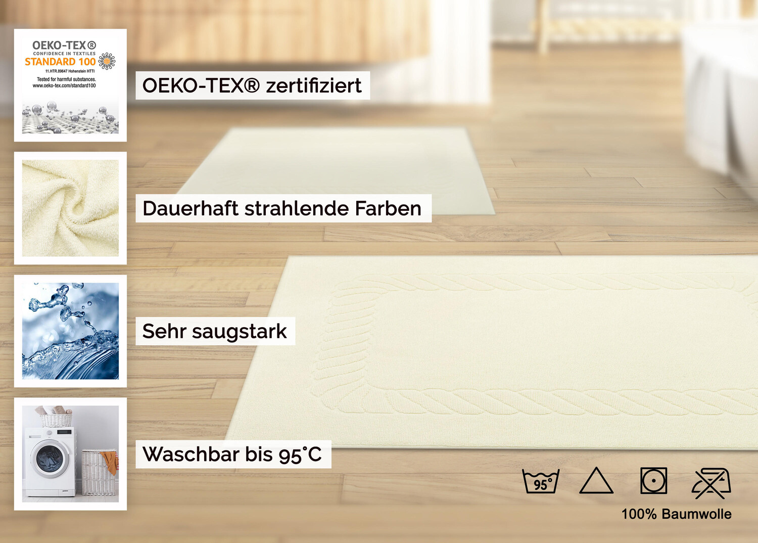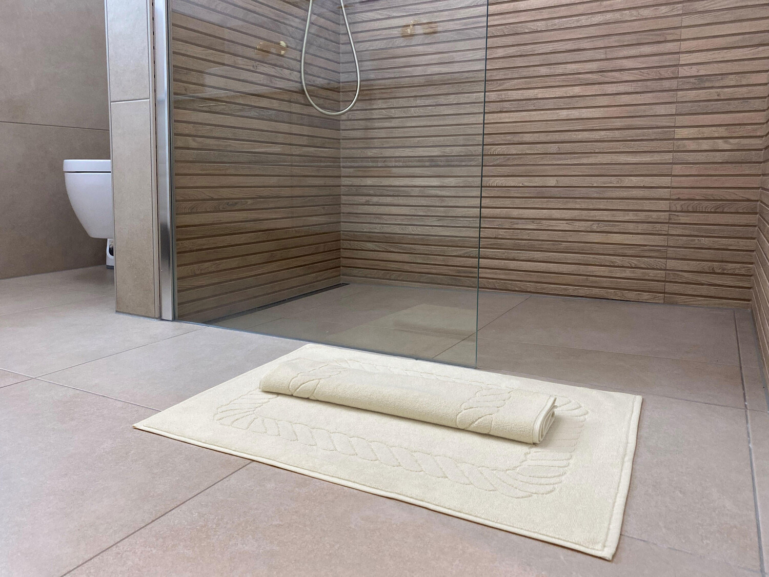 Дополнительный комфорт для вашей ванной комнаты: с этим ковриком для ванной ваши ноги снова будут сухими сразу после теплого душа или расслабляющей ванны. При зимних температурах они также подходят в качестве небольших полозьев перед раковиной или перед унитазом, чтобы ваши ноги были в тепле. Уютные коврики для ванной размером 50x70 см имеют вес материала 740 г/кв.м и имеют двойную безопасность. шов по продольным швам. Они изготовлены из 100% хлопка, переработанного в крученую махровую ткань. Это придает коврику для ванны естественного цвета приятную массажную функцию и делает его чрезвычайно впитывающим, что идеально подходит для только что вымытых ног. Прочные коврики для ванной также впечатляют элегантным узором в виде кос и прекрасным выбором цветов. Индантреновое окрашивание предотвращает вымывание ярких цветов. Поэтому прочный хлопковый коврик можно стирать при температуре 95°C и сушить в стиральной машине.