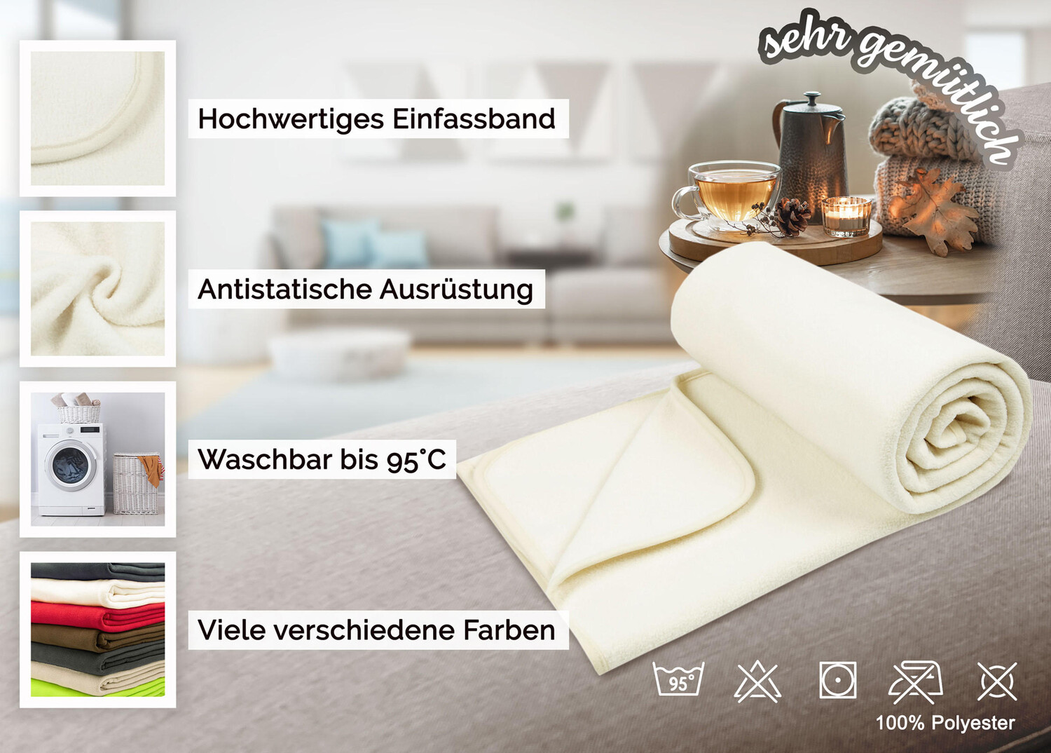 Флисовые одеяла станут уютными спутниками во многих сферах и мгновенно создадут уют. Это приятное мягкое одеяло практичного размера 130/170 см является одним из универсальных и может использоваться по-разному. Как уютное одеяло для дивана, детское одеяло в кроватке, защитное одеяло, для холодных вечеров на балконе или даже как одеяло для домашних животных. Прочное и гипоаллергенное диванное одеяло изготовлено из 100% полиэстера плотностью 260 г/м². Качественная бейковая лента предотвращает осыпание краев одеяла. Выберите свой любимый цвет для своего дома из множества великолепных цветов. Даже при частом использовании антистатическое покрывало для телевизора кремового цвета не оставляет ворса, поскольку оснащено специальными приспособлениями, препятствующими скатыванию. Для обеспечения идеальной гигиены одеяло, простое в уходе, можно стирать при температуре до 95° C и, конечно же, сушить в стиральной машине.