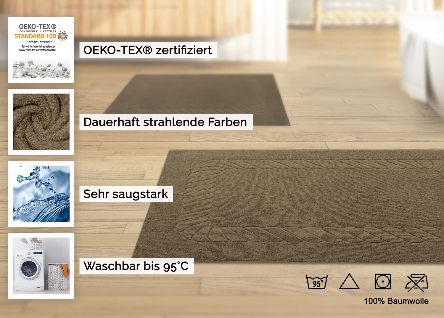 Дополнительный комфорт для вашей ванной комнаты: с этим ковриком для ванной ваши ноги снова будут сухими сразу после теплого душа или расслабляющей ванны. При зимних температурах они также подходят в качестве небольших полозьев перед раковиной или перед унитазом, чтобы ваши ноги были в тепле. Уютные коврики для ванной размером 50x70 см имеют вес материала 740 г/кв.м и имеют двойную безопасность. шов по продольным швам. Они изготовлены из 100% хлопка, переработанного в крученую махровую ткань. Это придает коричневому коврику для ванной приятную массажную функцию и делает его чрезвычайно впитывающим, что идеально подходит для только что вымытых ног. Прочные коврики для ванной также впечатляют элегантным узором в виде кос и прекрасным выбором цветов. Индантреновое окрашивание предотвращает вымывание ярких цветов. Поэтому прочный хлопковый коврик можно стирать при температуре 95°C и сушить в стиральной машине.
