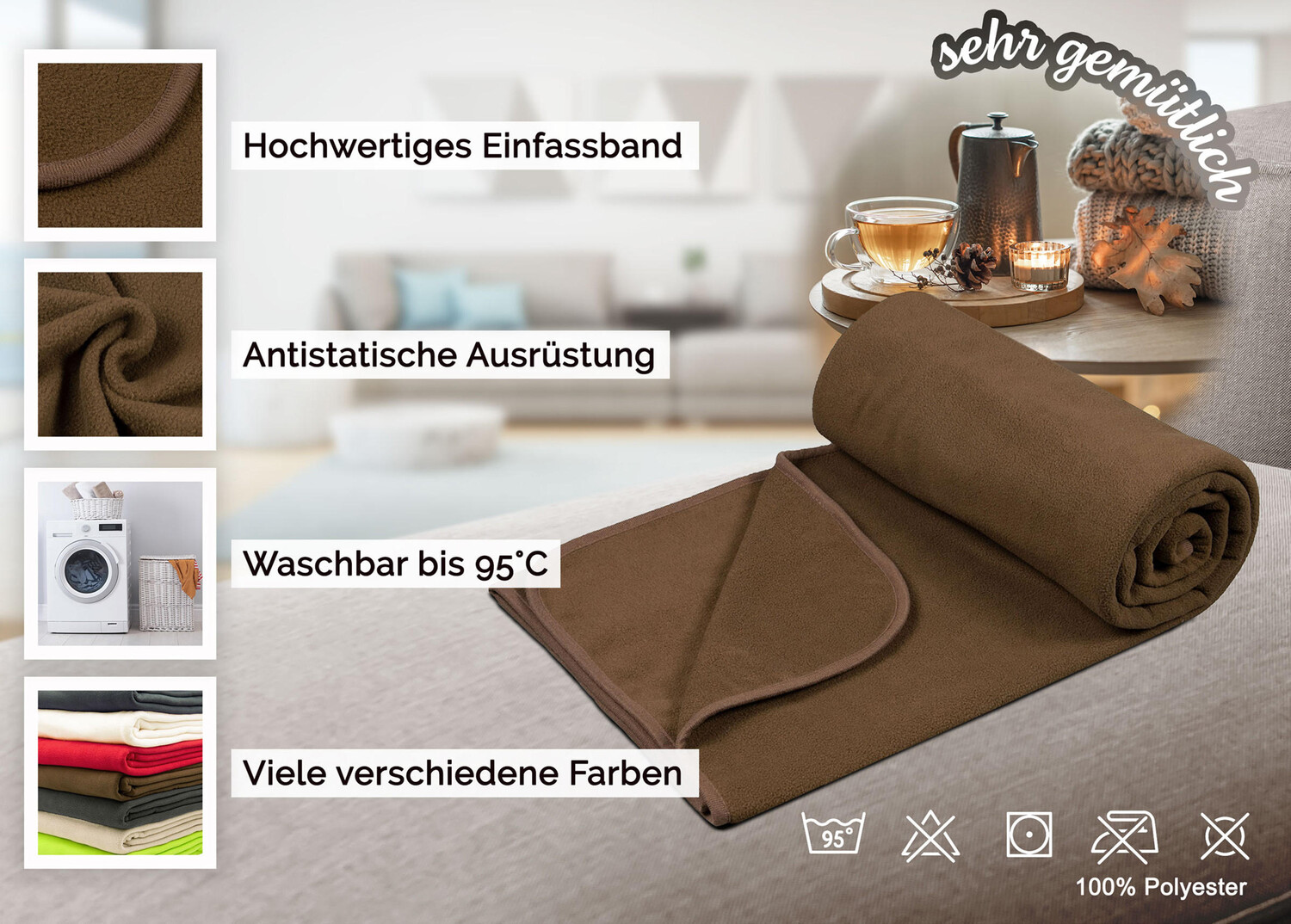 Флисовые одеяла станут уютными спутниками во многих сферах и мгновенно создадут уют. Это приятное мягкое одеяло практичного размера 130/170 см является одним из универсальных и может использоваться по-разному. Как уютное одеяло для дивана, детское одеяло в кроватке, защитное одеяло, для холодных вечеров на балконе или даже как одеяло для домашних животных. Прочное и гипоаллергенное диванное одеяло изготовлено из 100% полиэстера плотностью 260 г/м². Качественная бейковая лента предотвращает осыпание краев одеяла. Выберите свой любимый цвет для своего дома из множества великолепных цветов. Антистатическое коричневое покрывало для телевизора даже при частом использовании не оставляет ворса, поскольку оснащено специальными приспособлениями, препятствующими скатыванию. Для обеспечения идеальной гигиены одеяло, простое в уходе, можно стирать при температуре до 95° C и, конечно же, сушить в стиральной машине.