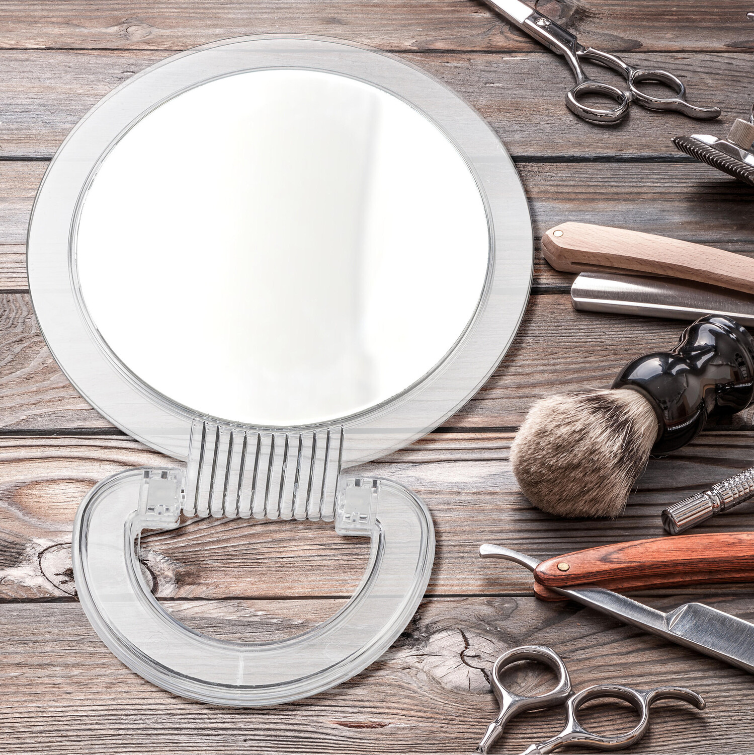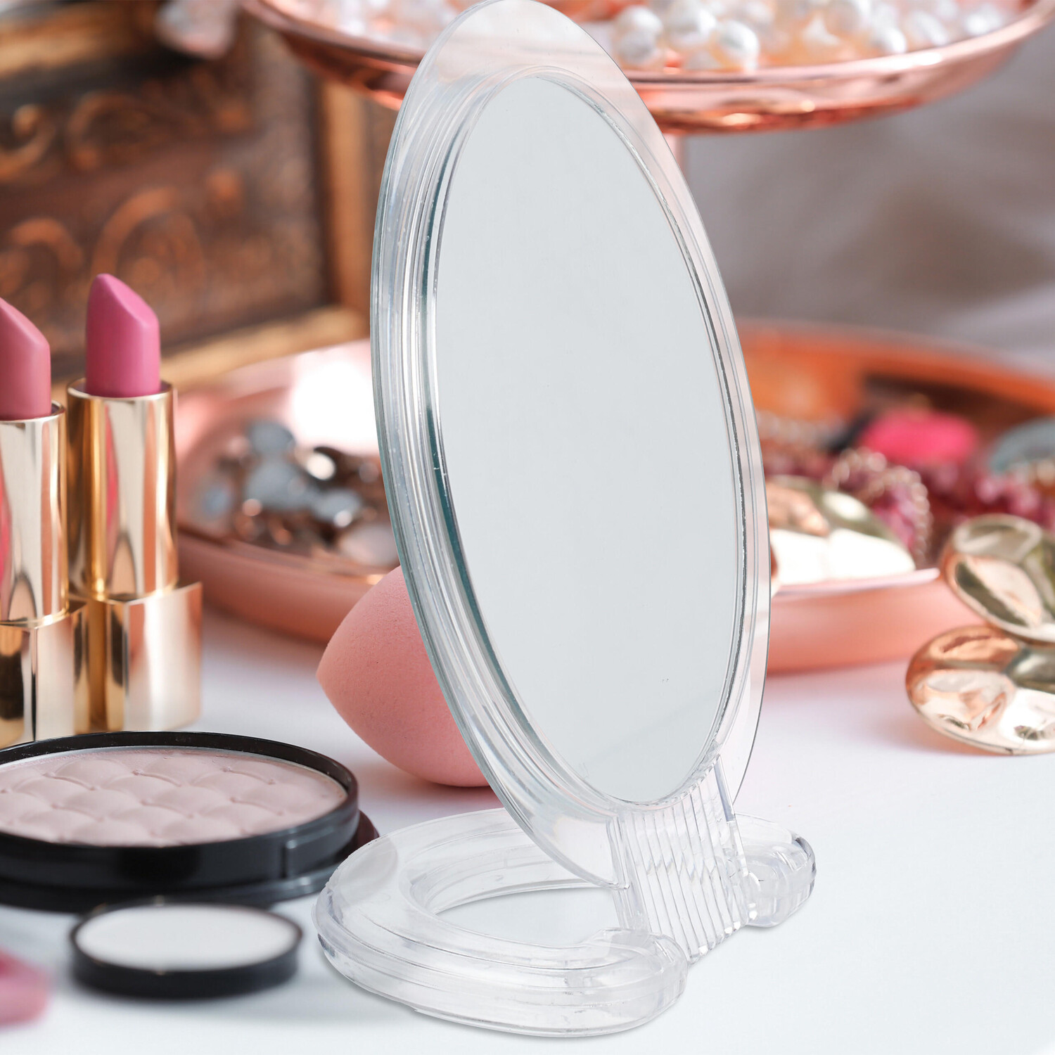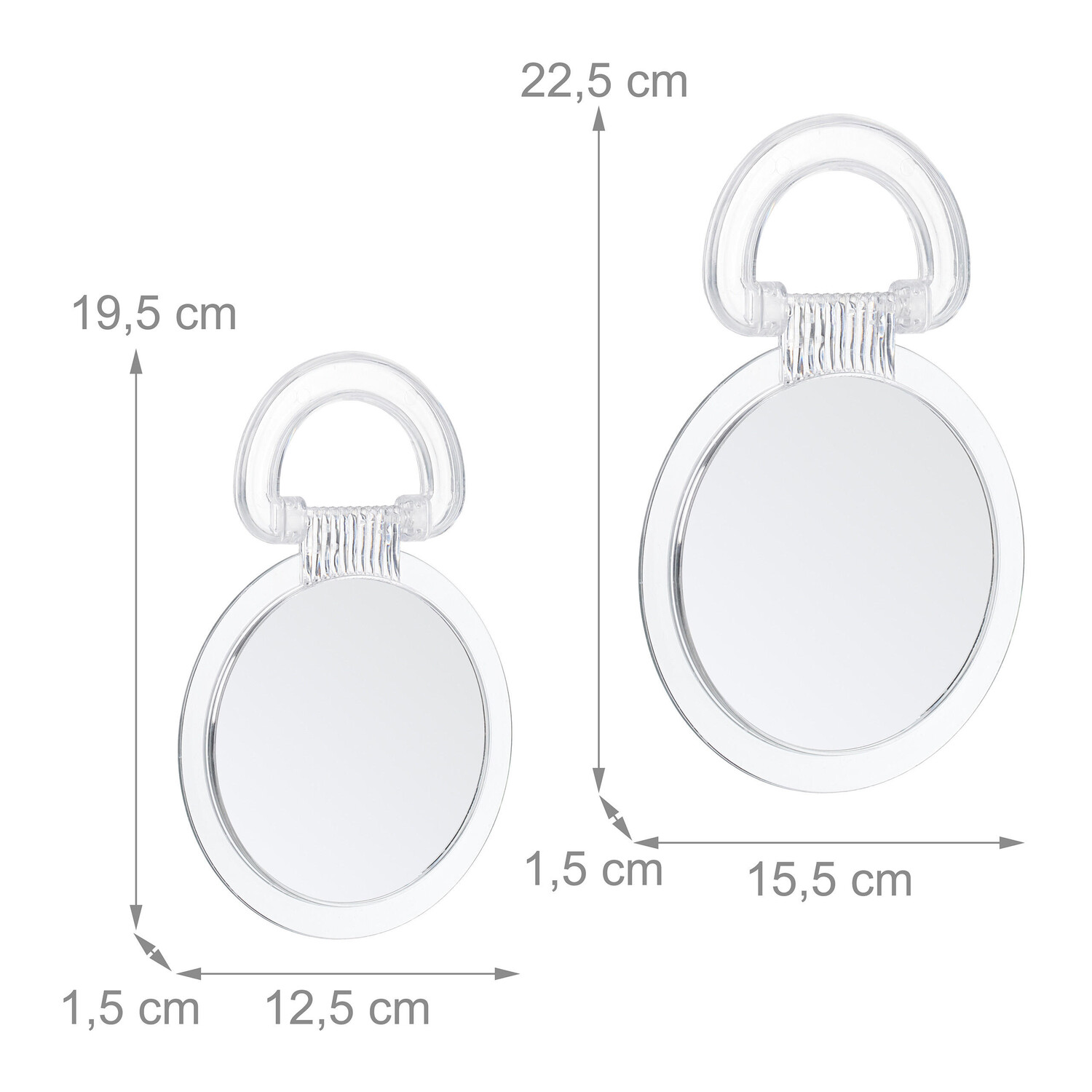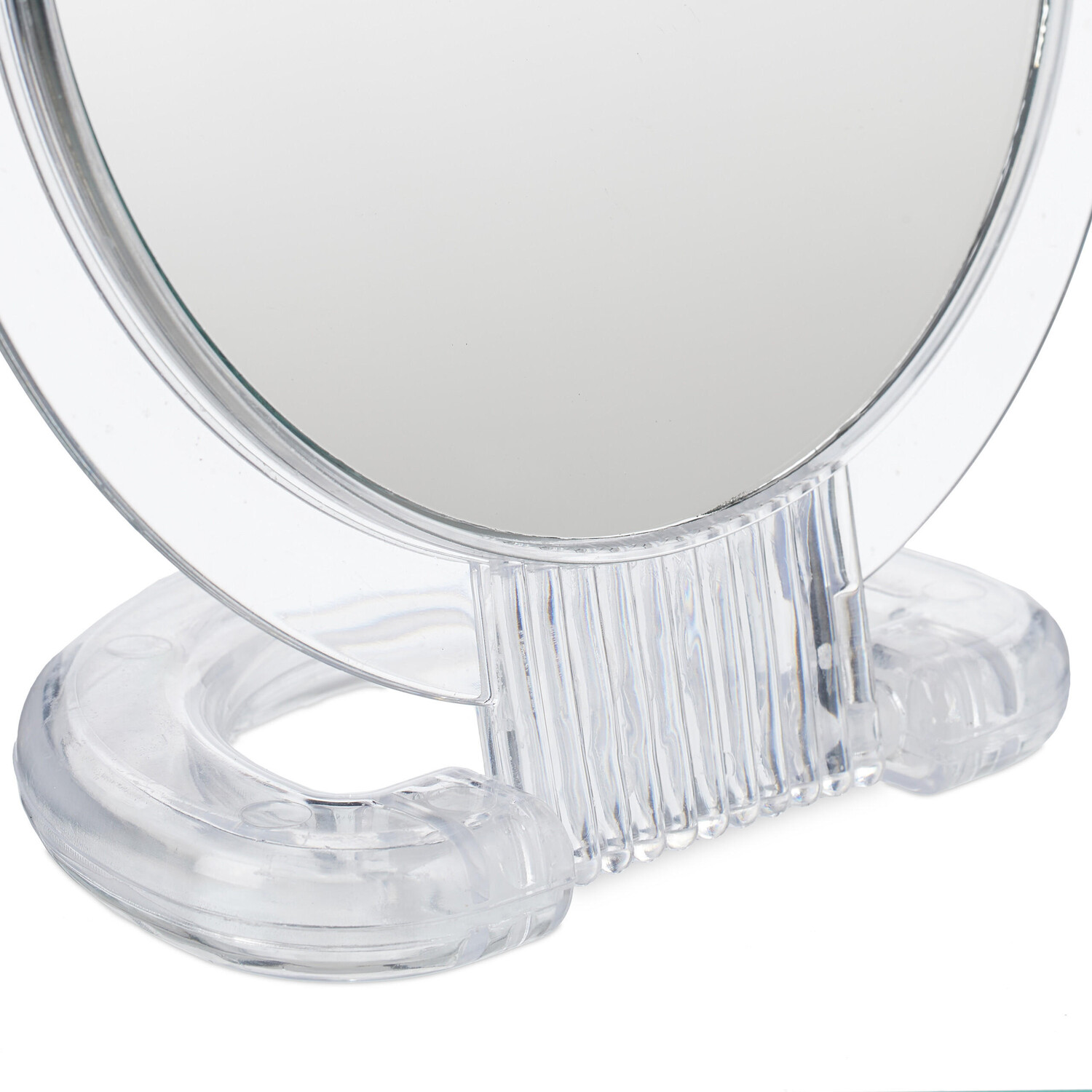 Зеркало-стойка со складной ручкойКруглые косметические зеркала в прозрачной рамке помогут вам в ежедневном уходе за лицом, например, при нанесении макияжа или бритье. Ручные зеркала имеют складную ручку, которую можно держать или использовать для стояния. Одна сторона косметического зеркала имеет двукратное увеличение, а другая зеркальная поверхность показывает нормальный вид. Два зеркала разных размеров идеально подходят для того, чтобы брать их с собой в путешествие или поход.