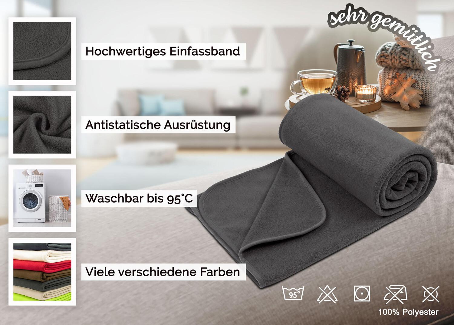 Флисовые одеяла станут уютными спутниками во многих сферах и мгновенно создадут уют. Это приятное мягкое одеяло практичного размера 130/170 см является одним из универсальных и может использоваться по-разному. Как уютное одеяло для дивана, детское одеяло в кроватке, защитное одеяло, для холодных вечеров на балконе или даже как одеяло для домашних животных. Прочное и гипоаллергенное диванное одеяло изготовлено из 100% полиэстера плотностью 260 г/м². Качественная бейковая лента предотвращает осыпание краев одеяла. Выберите свой любимый цвет для своего дома из множества великолепных цветов. Даже при частом использовании антистатическое покрывало для телевизора антрацитового цвета не оставляет ворса, поскольку оснащено средствами защиты от катышков. Для обеспечения идеальной гигиены одеяло, простое в уходе, можно стирать при температуре до 95° C и, конечно же, сушить в стиральной машине.