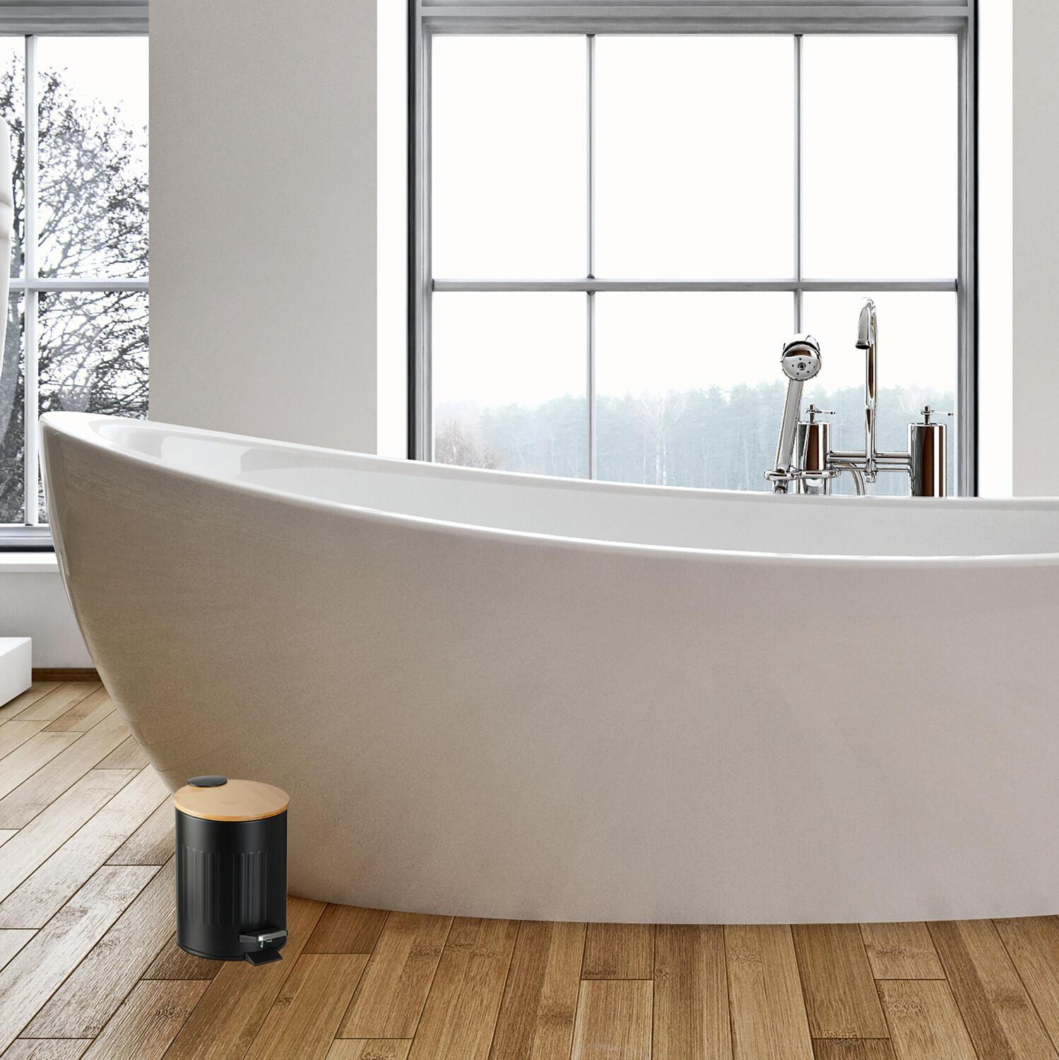 Небольшой педальный контейнер для мусора для ванной комнаты. Круглый педальный контейнер позволяет гигиенично и удобно выбрасывать гигиенические отходы в ванной комнате и на туалетном столике. Корзину для ванной можно открыть без помощи рук с помощью практичной педали, а крышку можно закрыть особенно мягко и бесшумно благодаря функции плавного закрывания. Съемный пластиковый контейнер с ручкой облегчает его опорожнение. Визуально мусорное ведро для ванной впечатляет своей матовой поверхностью и крышкой из натурального бамбука.