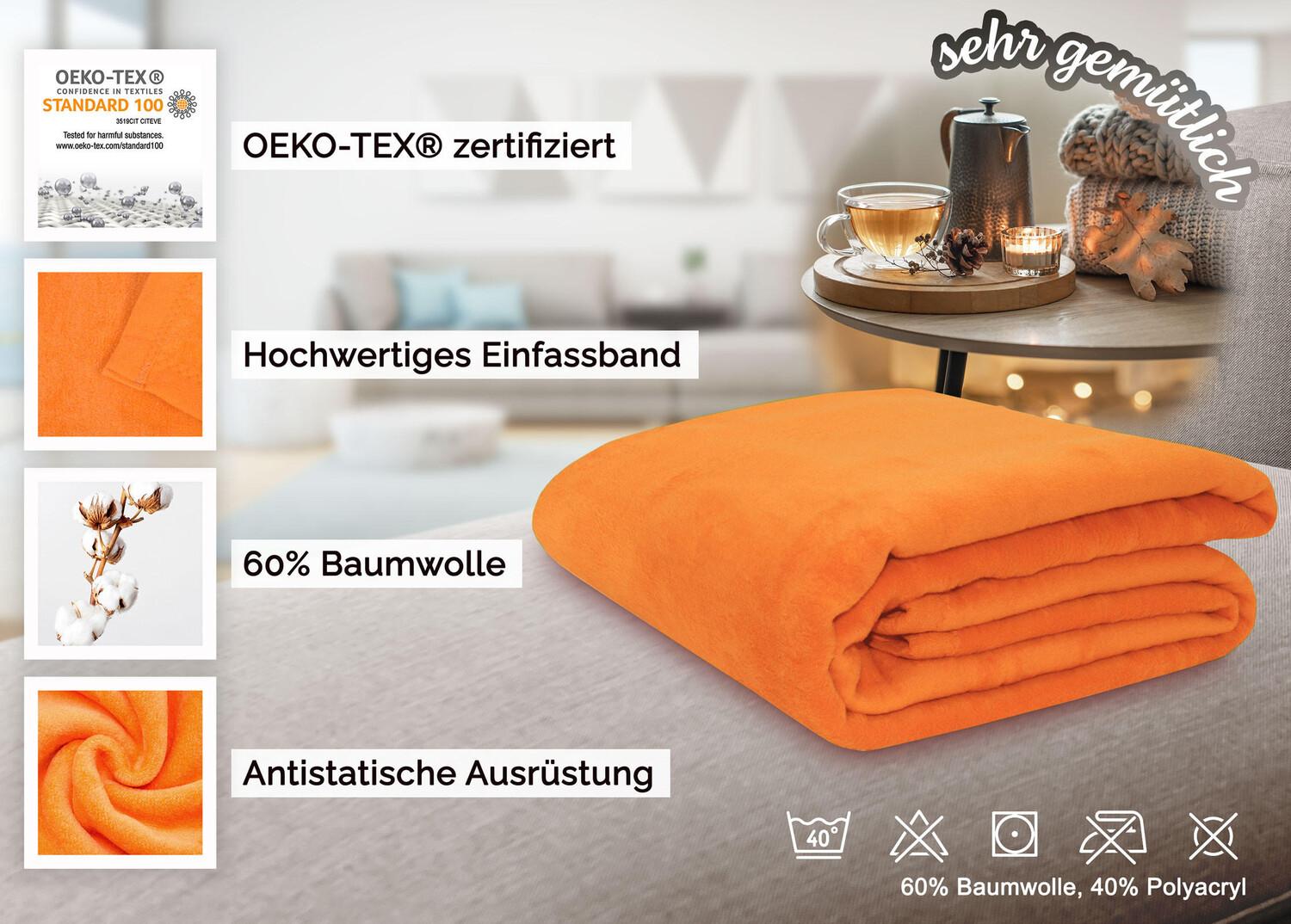 Наслаждайтесь осенними и зимними днями, лежа на диване и уютно устроившись в этом мягком одеяле. Благодаря большому выбору цветов вы сможете подобрать цвет, подходящий для вашего дома. Мягкое одеяло оранжевого цвета изготовлено из 60 % хлопка и 40 % полиакрила, плотность материала составляет 425 г/м². Благодаря такому составу материала диванное одеяло получается особенно прочным, мягким и согревающим. Специальный производственный процесс снижает статические заряды и связанные с ними неприятные удары электрическим током. Выбирайте из двух разных размеров и разных цветов. Легкое в уходе покрывало можно стирать в стиральной машине при температуре 40°C, а также сушить в стиральной машине. Это значит, что волокна останутся пушистыми, и вы сможете долго наслаждаться новым одеялом. Подарите это одеяло своим близким, например, на Рождество или на день рождения!