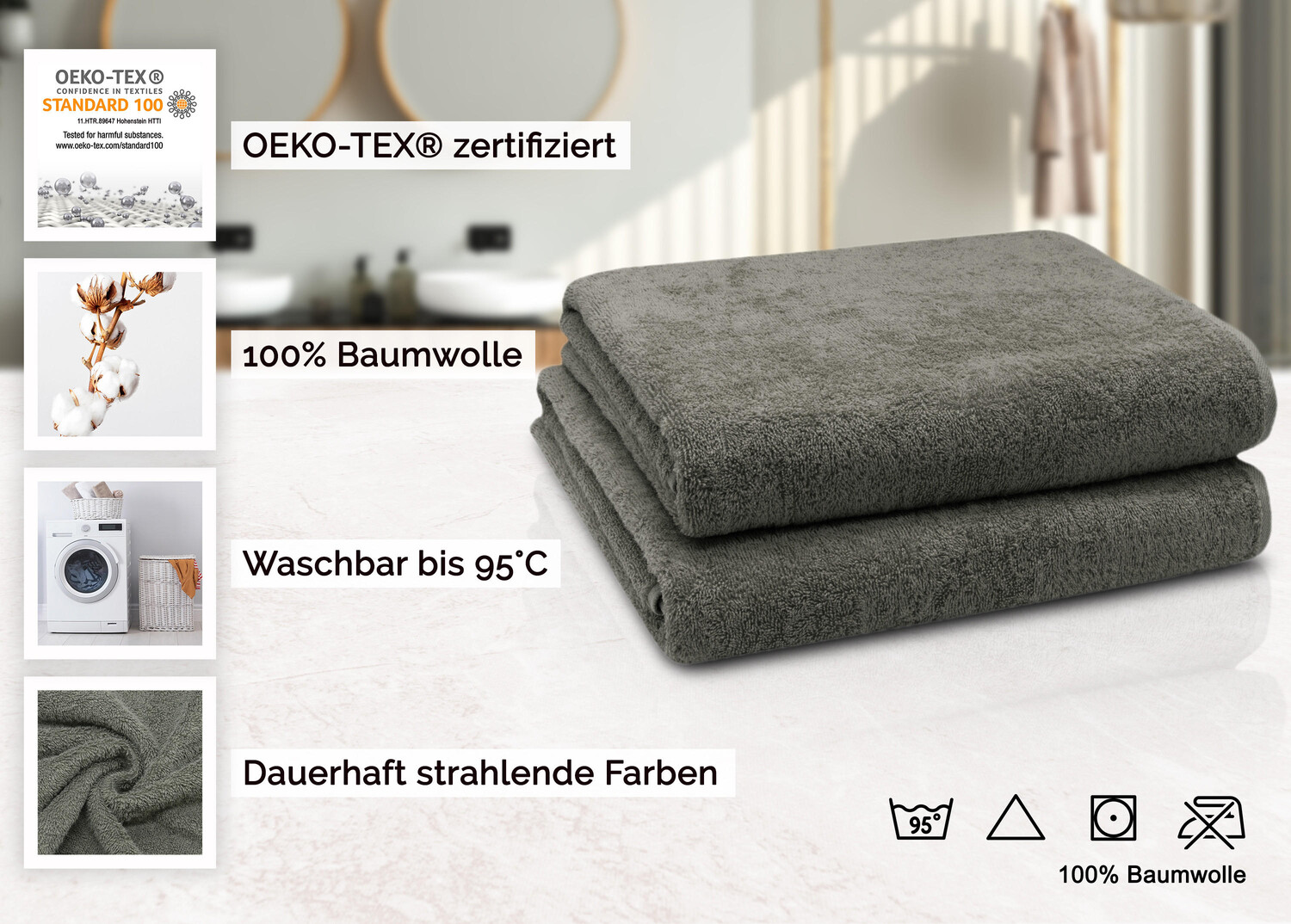 Создайте ощущение роскоши в своем собственном оздоровительном оазисе с помощью этих приятных мягких полотенец. Это очень большое полотенце идеально подойдет не только для ванной комнаты, но и для следующего посещения сауны или в качестве пляжного полотенца. Благодаря прекрасному выбору цветов ваш творческий потенциал не ограничен. Окрашивание индантреном обеспечивает максимальную стабильность цвета. Для обеспечения гигиенической чистоты полотенца можно стирать при кипячении и сушить в стиральной машине. Прочные банные полотенца размером 100x150 см изготовлены из 100% хлопка с плотностью материала 420 г/м² и обработаны. махровая ткань. Махровая ткань очень пушистая и чрезвычайно впитывающая, что делает ее идеальным полотенцем для душа. Кроме того, мягкие хлопковые полотенца серо-коричневого цвета оснащены двойным безопасным швом и практичной вешалкой.