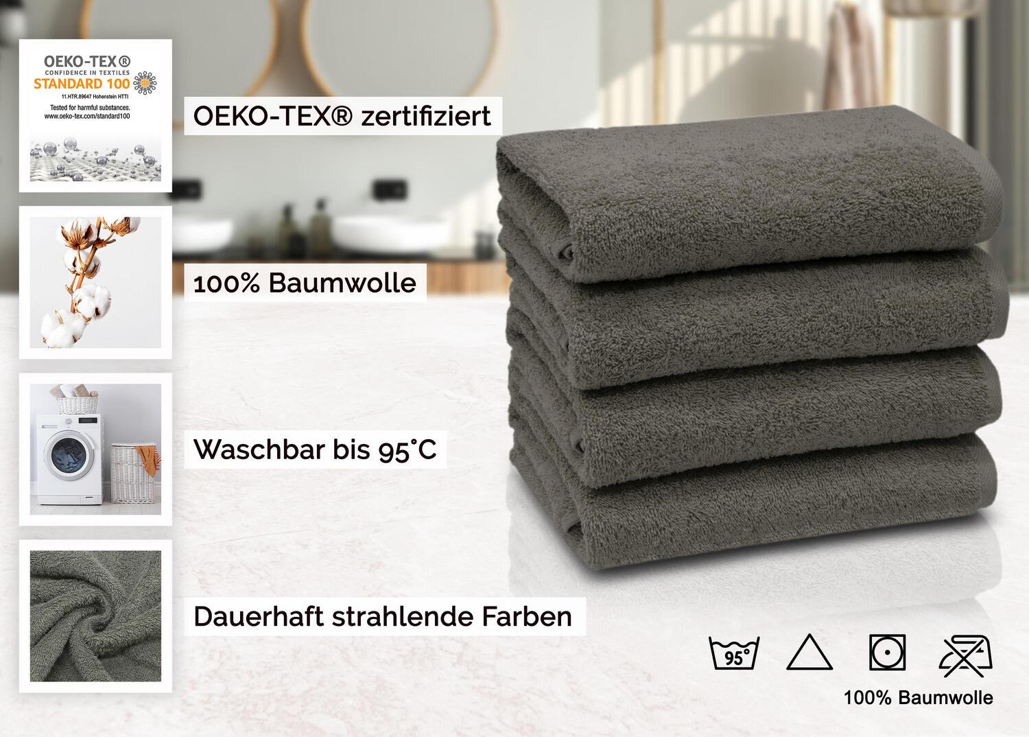Будь то махровое полотенце для волос, полотенце для сауны или полотенце для душа – полотенце просто необходимо. Благодаря большому выбору цветов, казалось бы, незаметная ткань становится приковывающей взгляд. Особый плюс – окраска индантреном, обеспечивающая высокую стабильность цвета. Даже после многократной стирки полотенце для душа продолжает сиять вашим любимым серо-коричневым цветом. Для обеспечения гигиенической чистоты полотенца можно стирать при температуре 95°C и сушить в стиральной машине. Они изготовлены из 100% хлопка, переработанного в махровую ткань. Это делает их особенно пушистыми и впитывающими. Кроме того, махровые полотенца оснащены двойным предохранительным швом. Полотенца с вешалкой продаются в практичной упаковке по 4 штуки, поэтому вся семья будет хорошо оборудована. Их размер 50 х 100 см, плотность материала около 420 г/кв.м.