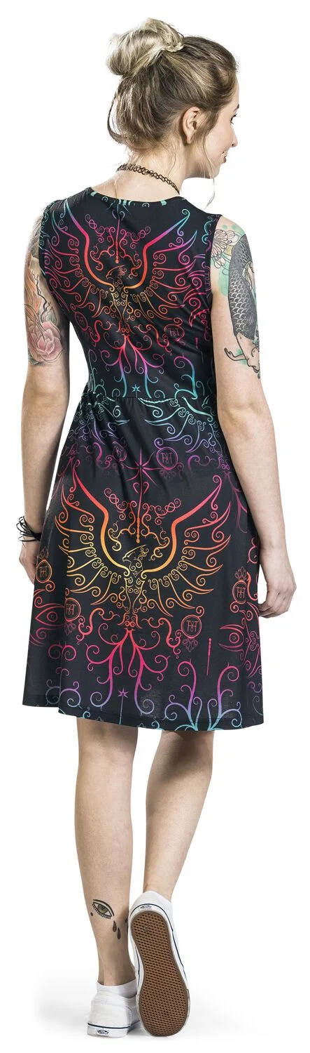 Феникс - волшебная птица, перья которой светятся, как пламя. Поклонники Гарри Поттера знают жар-птицу, которая олицетворяет возрождение. Патронус Дамблдора — феникс. Отсюда и произошло название Ордена Феникса. С этим платьем средней длины вы сможете воздать должное волшебной птице.