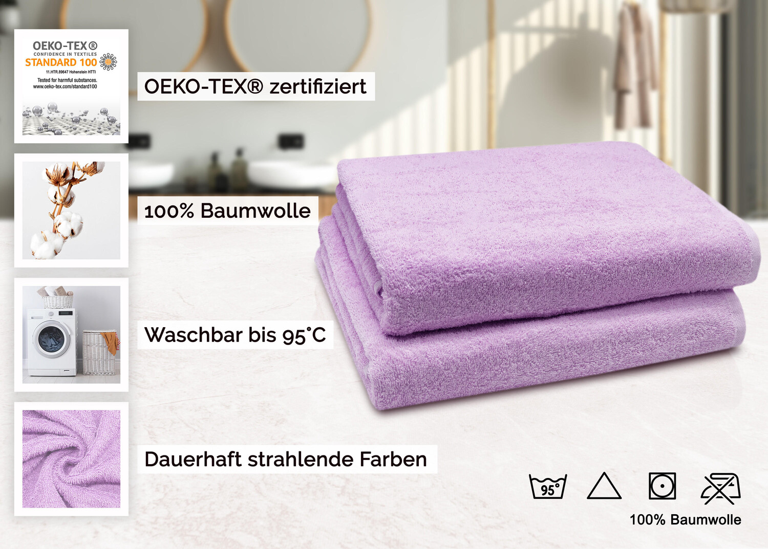 Создайте ощущение роскоши в своем собственном оздоровительном оазисе с помощью этих приятных мягких полотенец. Это очень большое полотенце идеально подойдет не только для ванной комнаты, но и для следующего посещения сауны или в качестве пляжного полотенца. Благодаря прекрасному выбору цветов ваш творческий потенциал не ограничен. Окрашивание индантреном обеспечивает максимальную стабильность цвета. Для обеспечения гигиенической чистоты полотенца можно стирать при кипячении и сушить в стиральной машине. Прочные банные полотенца размером 100x150 см изготовлены из 100% хлопка с плотностью материала 420 г/м² и обработаны. махровая ткань. Махровая ткань очень пушистая и чрезвычайно впитывающая, что делает ее идеальным полотенцем для душа. Кроме того, мягкие хлопковые полотенца фиолетового цвета оснащены двойным безопасным швом и практичной вешалкой.