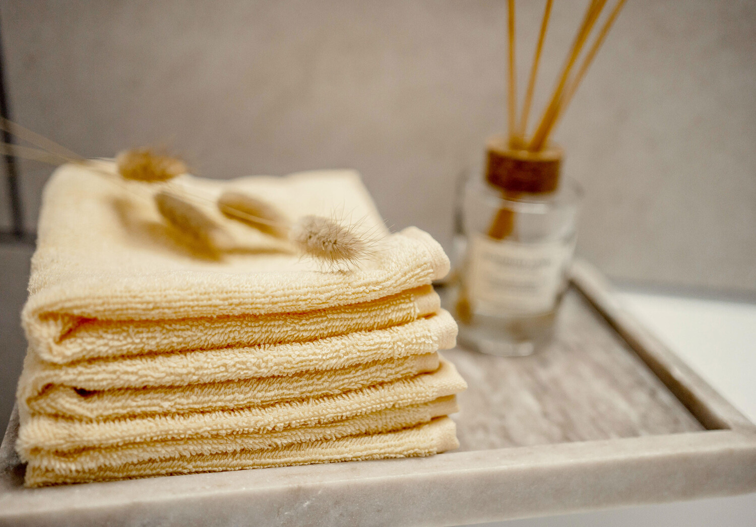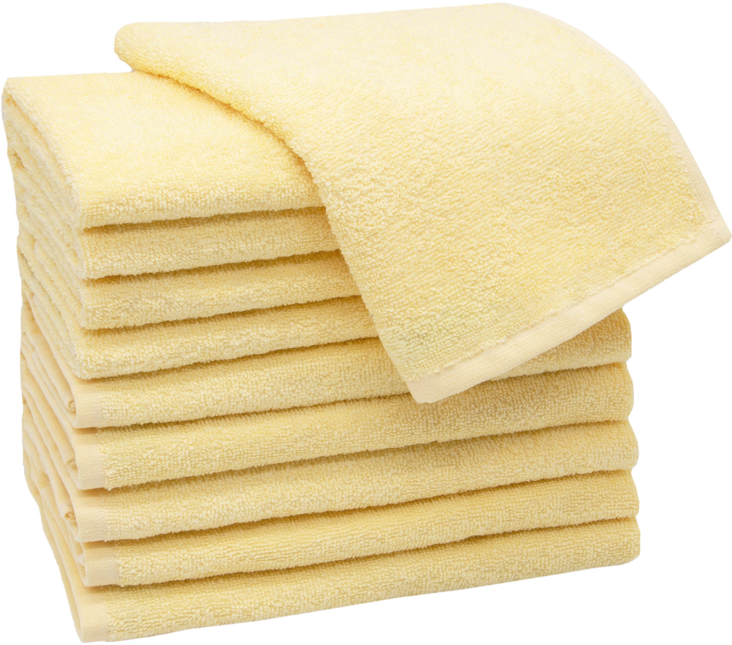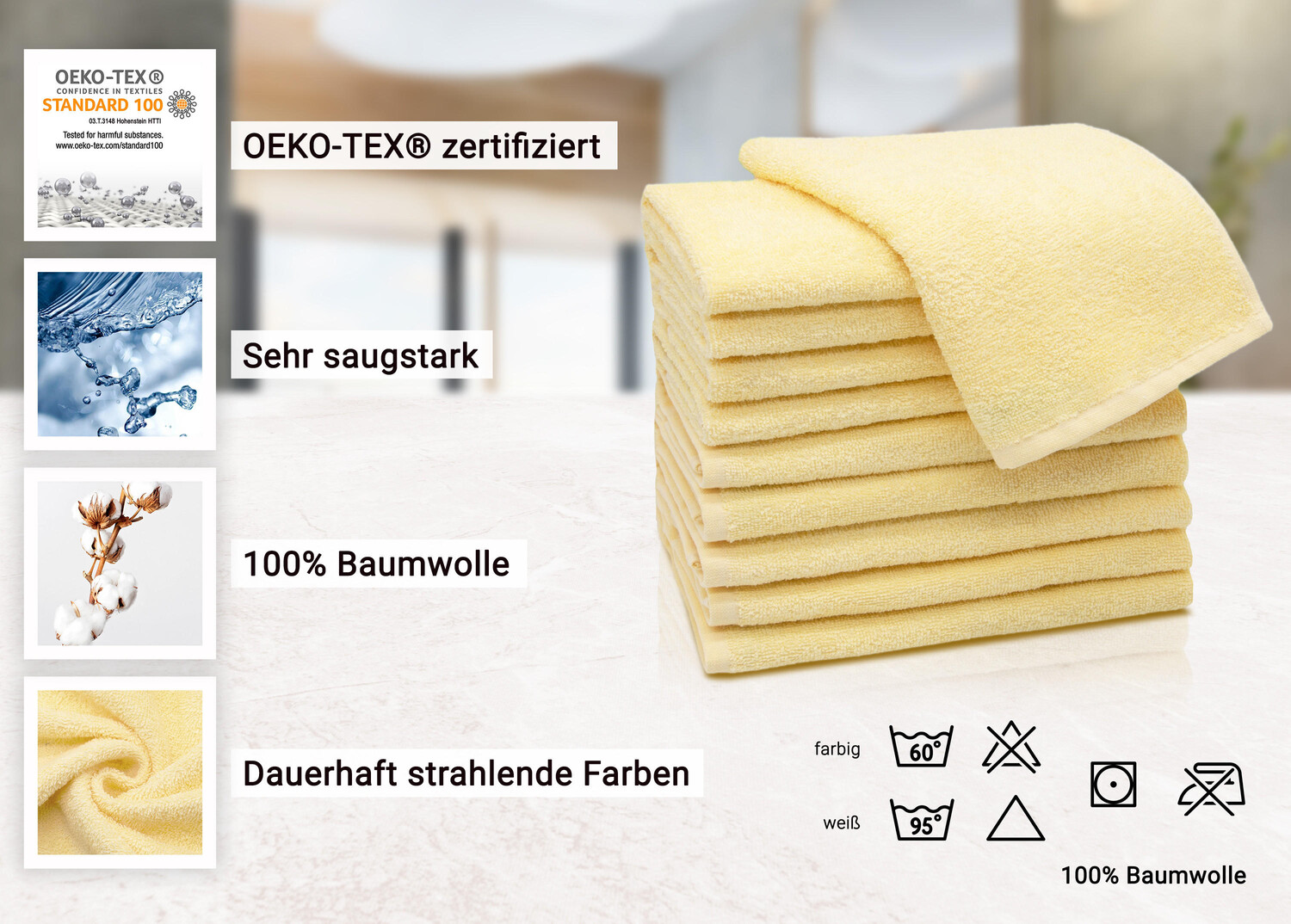 Гостевые полотенца подходят не только, как следует из названия, для гостевого туалета, они также очень практичны в качестве небольшого полотенца для вашего ребенка, экологически чистой салфетки для ежедневного очищения лица или просто в качестве чистящего полотенца для ванной комнаты. Полотна размером 30х50 см изготовлены из 100% хлопка и весят 400 г/кв.м. Натуральный материал переработан в махровую ткань, что делает желтые хлопчатобумажные полотенца особенно мягкими и приятными для кожи. Набор доступен в различных красивых цветах, так что вы сможете найти подходящее гостевое полотенце. Реактивно окрашенные мыльные полотенца можно стирать при температуре до 60°C (цветное) и до 95°C (белое). Они также подходят для сушки в сушильной машине. Поскольку у них нет каймы, тряпки не коробятся при стирке. В комплект махровых полотенец входит вешалка.