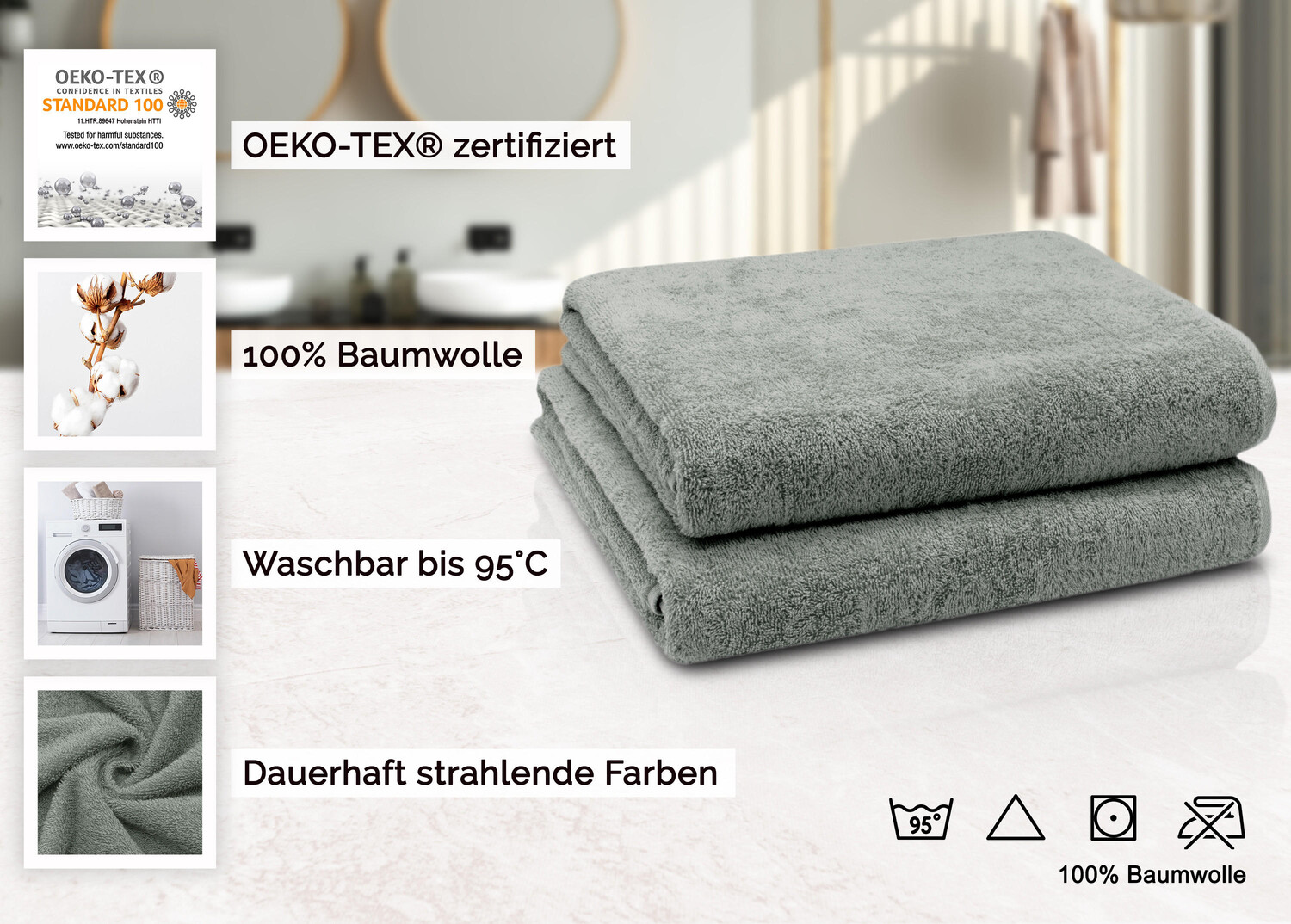 Создайте ощущение роскоши в своем собственном оздоровительном оазисе с помощью этих приятных мягких полотенец. Это очень большое полотенце идеально подойдет не только для ванной комнаты, но и для следующего посещения сауны или в качестве пляжного полотенца. Благодаря прекрасному выбору цветов ваш творческий потенциал не ограничен. Окрашивание индантреном обеспечивает максимальную стабильность цвета. Для обеспечения гигиенической чистоты полотенца можно стирать при кипячении и сушить в стиральной машине. Прочные банные полотенца размером 100x150 см изготовлены из 100% хлопка с плотностью материала 420 г/м² и обработаны. махровая ткань. Махровая ткань очень пушистая и чрезвычайно впитывающая, что делает ее идеальным полотенцем для душа. Мягкие хлопковые полотенца светло-серого цвета оснащены двойным безопасным швом и практичной вешалкой.
