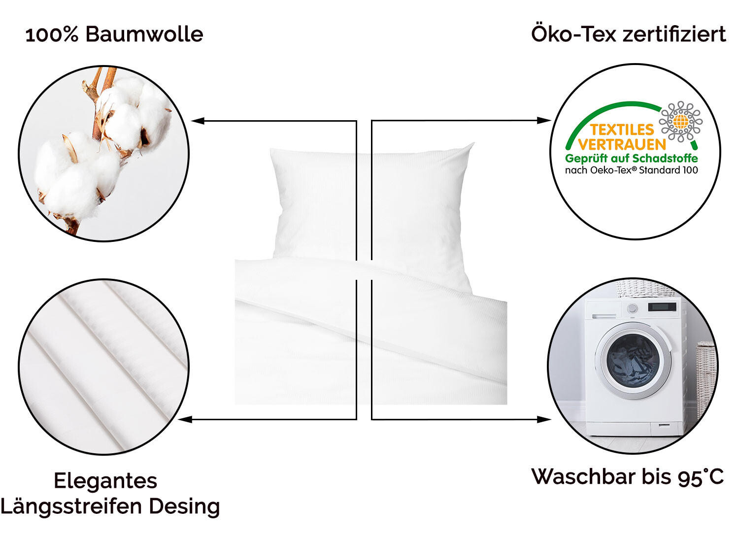 С этим легким комплектом постельного белья вы сможете насладиться спокойным сном. Он имеет приятный вес около 145 г/кв.м. Мы придаем большое значение проверенному производству. Красивые полосатые чехлы из хлопкового сатина можно стирать при температуре до 95°C, безопасно кипячать и использовать хлор, а также можно сушить в стиральной машине. Простой комплект постельного белья состоит из наволочки размером примерно 80x80 см. и пододеяльник размером примерно 140х200 см. Благодаря ненавязчивому дизайну постельное белье прекрасно комбинируется. Благодаря практичному замку постельное белье также можно быстро и легко сменить. Это означает, что порванные пуговицы и застрявшие молнии остались в прошлом. В зависимости от вашего вкуса для нашего постельного белья доступны полосы разной ширины. Выбирайте между 3 мм, 4 мм, 10 мм, 20 мм или 30 мм.