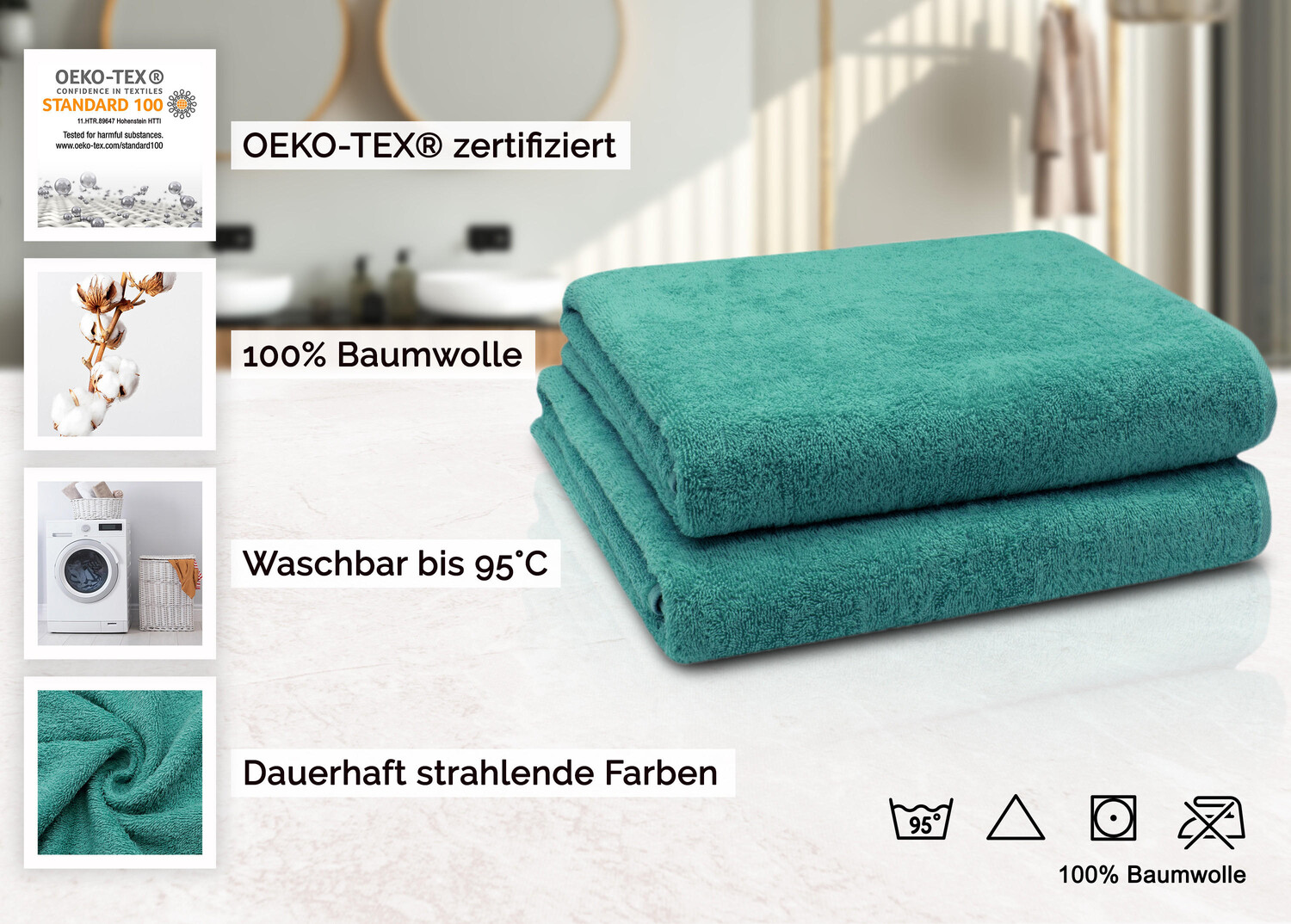 Создайте ощущение роскоши в своем собственном оздоровительном оазисе с помощью этих приятных мягких полотенец. Это очень большое полотенце идеально подойдет не только для ванной комнаты, но и для следующего посещения сауны или в качестве пляжного полотенца. Благодаря прекрасному выбору цветов ваш творческий потенциал не ограничен. Окрашивание индантреном обеспечивает максимальную стабильность цвета. Для обеспечения гигиенической чистоты полотенца можно стирать при кипячении и сушить в стиральной машине. Прочные банные полотенца размером 100x150 см изготовлены из 100% хлопка с плотностью материала 420 г/м² и обработаны. махровая ткань. Махровая ткань очень пушистая и чрезвычайно впитывающая, что делает ее идеальным полотенцем для душа. Мягкие хлопковые полотенца бирюзового цвета оснащены двойным безопасным швом и практичной вешалкой.