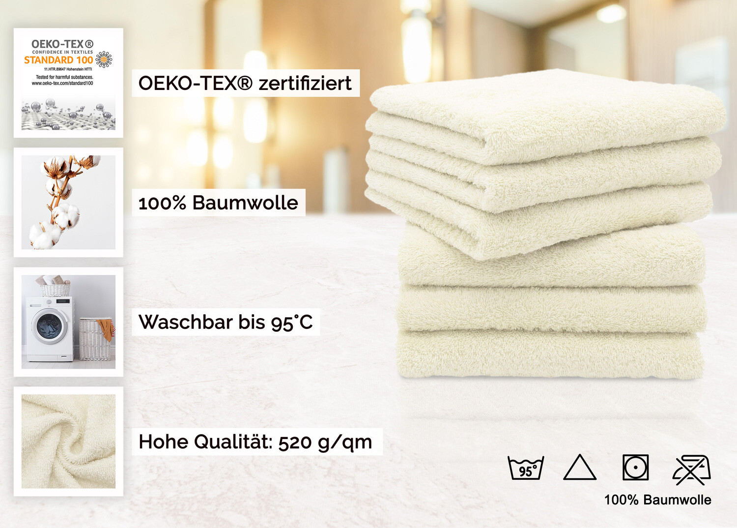 Будь то для ваших детей, гостей или для спортзала – полотенец никогда не будет достаточно. Благодаря практичному набору из 6 штук о вас позаботятся. Для обеспечения гигиенической чистоты небольшие полотенца для душа можно стирать при температуре 95°C и сушить в стиральной машине. Прочное махровое полотенце доступно во многих великолепных цветах, которые благодаря красителю индантрен не вымываются даже при высоких температурах. Таким образом, вы сможете долгое время наслаждаться своим новым полотенцем кремового цвета. Махровые полотенца плотностью материала около 520 г/м² изготовлены из 100% хлопка, вплетенного в махровую ткань. Это делает их особенно мягкими и приятными на коже. Кроме того, впитывающие хлопковые полотенца размером 50х100 см оснащены практичной вешалкой и двойным предохранительным швом по длинным сторонам.