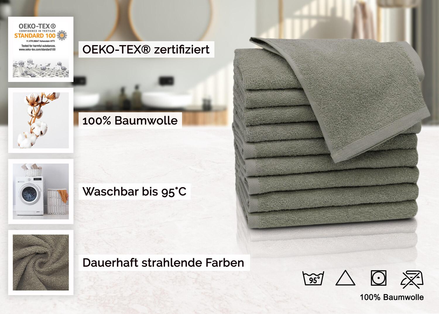 Элегантные цвета для гостевого туалета, мягкие для кухни или шикарные, современные цвета для вашей собственной ванной комнаты – благодаря большому выбору цветов нет никаких ограничений для вашего творчества. Для обеспечения гигиенической чистоты небольшие полотенца в практичной упаковке по 10 штук устойчивы к кипячению, стирке и сушке в стиральной машине. Благодаря индантреновому окрашиванию цвета сияют своей обычной интенсивностью даже после многочисленных стирок. Высококачественные мыльные полотенца изготовлены из 100% хлопка с плотностью материала около 420 г/м² и обладают особенной впитывающей способностью. Они сплетены как махровая ткань, что делает их невероятно мягкими и комфортными для кожи. Гостевые полотенца размером 30x50 см коричнево-серого цвета имеют практичную вешалку и двойной предохранительный шов.