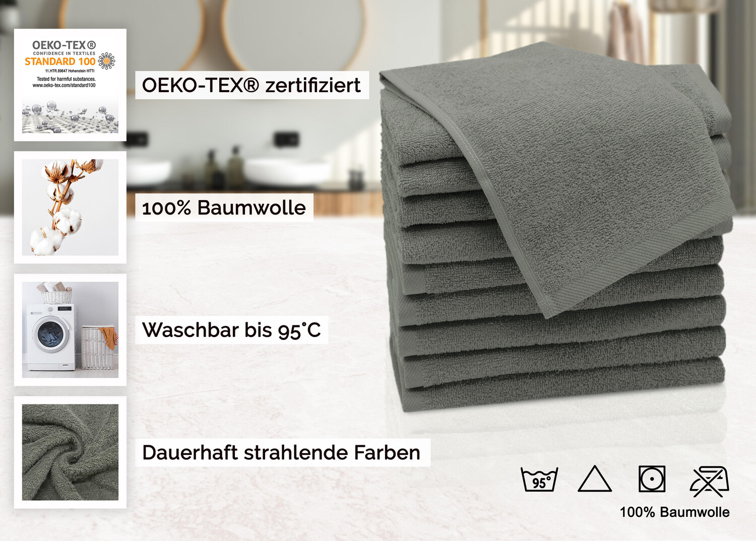 Элегантные цвета для гостевого туалета, мягкие для кухни или шикарные, современные цвета для вашей собственной ванной комнаты – благодаря большому выбору цветов нет никаких ограничений для вашего творчества. Для обеспечения гигиенической чистоты небольшие полотенца в практичной упаковке по 10 штук устойчивы к кипячению, стирке и сушке в стиральной машине. Благодаря индантреновому окрашиванию цвета сияют своей обычной интенсивностью даже после многочисленных стирок. Высококачественные мыльные полотенца изготовлены из 100% хлопка с плотностью материала около 420 г/м² и обладают особенной впитывающей способностью. Они сплетены как махровая ткань, что делает их невероятно мягкими и комфортными для кожи. Гостевые полотенца размером 30x50 см серо-коричневого цвета также имеют практичную вешалку и двойной безопасный шов.