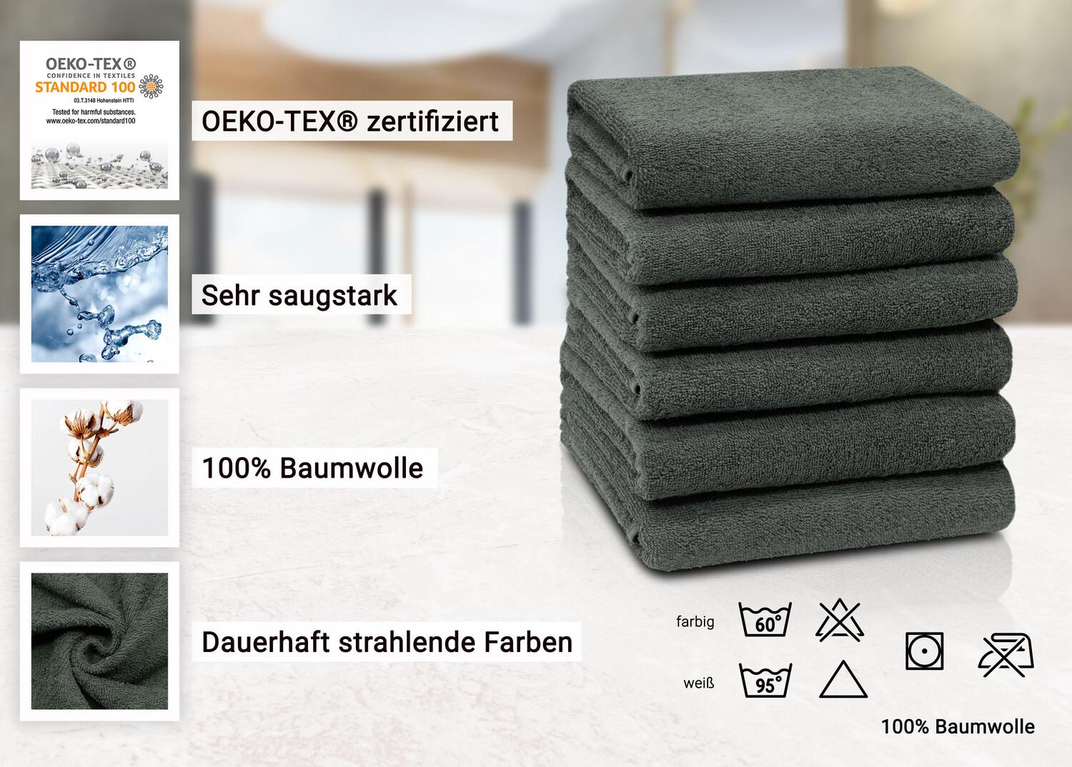 От младенцев до взрослых: банные полотенца размером 50 х 100 см идеально подходят для всех возрастных групп. Они изготовлены из 100% хлопка и имеют плотность материала около 400 г/кв.м. Натуральный материал был переработан в впитывающую и приятную мягкую махровую ткань, идеально подходящую для следующего похода в крытый бассейн или просто для ванной дома. Благодаря практичной упаковке из 6 штук темно-серого цвета вся семья будет обеспечена красивыми пушистыми полотенцами. Махровая ткань с биркой доступна во многих красивых цветах. Благодаря реактивному окрашиванию они очень быстро стираются и имеют великолепный блеск цвета. Для обеспечения абсолютной чистоты белые хлопковые полотенца можно стирать при температуре до 95°C или цветные при температуре до 60°C. Кроме того, они подходят для сушки в сушильной машине.