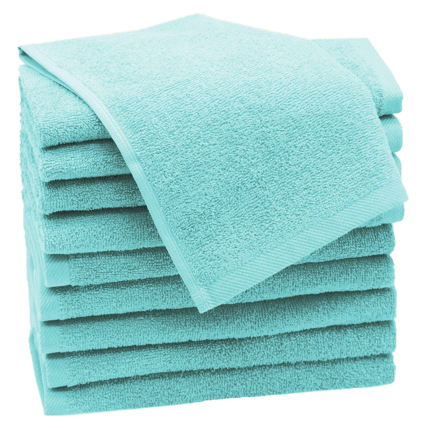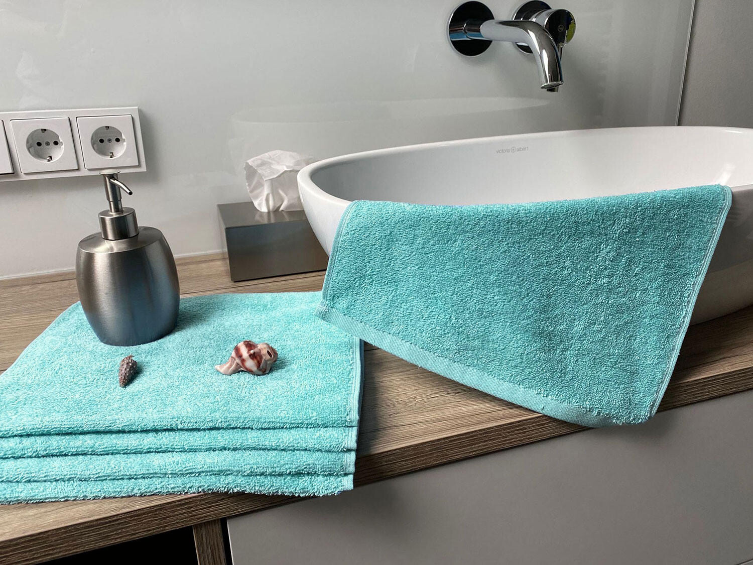 Элегантные цвета для гостевого туалета, мягкие для кухни или шикарные, современные цвета для вашей собственной ванной комнаты – благодаря большому выбору цветов нет никаких ограничений для вашего творчества. Для обеспечения гигиенической чистоты небольшие полотенца в практичной упаковке по 10 штук устойчивы к кипячению, стирке и сушке в стиральной машине. Благодаря индантреновому окрашиванию цвета сияют своей обычной интенсивностью даже после многочисленных стирок. Высококачественные мыльные полотенца изготовлены из 100% хлопка с плотностью материала около 420 г/м² и обладают особенной впитывающей способностью. Они сплетены как махровая ткань, что делает их невероятно мягкими и комфортными для кожи. Гостевые полотенца размером 30х50 см лазурно-синего цвета имеют практичную вешалку и двойной безопасный шов.