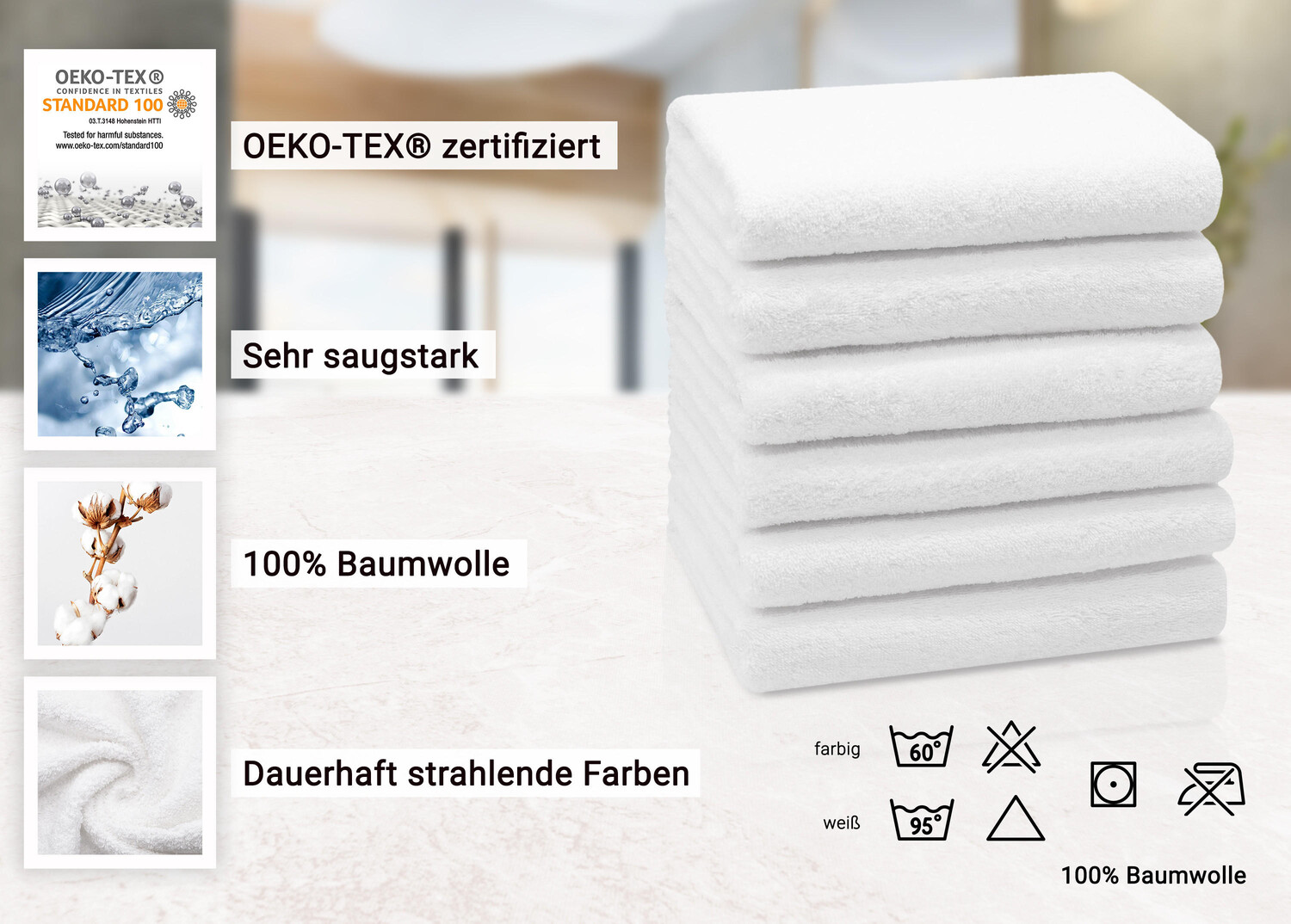 От младенцев до взрослых: банные полотенца размером 50 х 100 см идеально подходят для всех возрастных групп. Они изготовлены из 100% хлопка и имеют плотность материала около 400 г/кв.м. Натуральный материал был переработан в впитывающую и приятную мягкую махровую ткань, идеально подходящую для следующего похода в крытый бассейн или просто для ванной дома. Благодаря практичной упаковке из 6 штук белого цвета вся семья будет обеспечена красивыми пушистыми полотенцами. Махровая ткань с биркой доступна во многих красивых цветах. Благодаря реактивному окрашиванию они очень быстро стираются и имеют великолепный блеск цвета. Для обеспечения абсолютной чистоты белые хлопковые полотенца можно стирать при температуре до 95°C или цветные при температуре до 60°C. Кроме того, они подходят для сушки в сушильной машине.