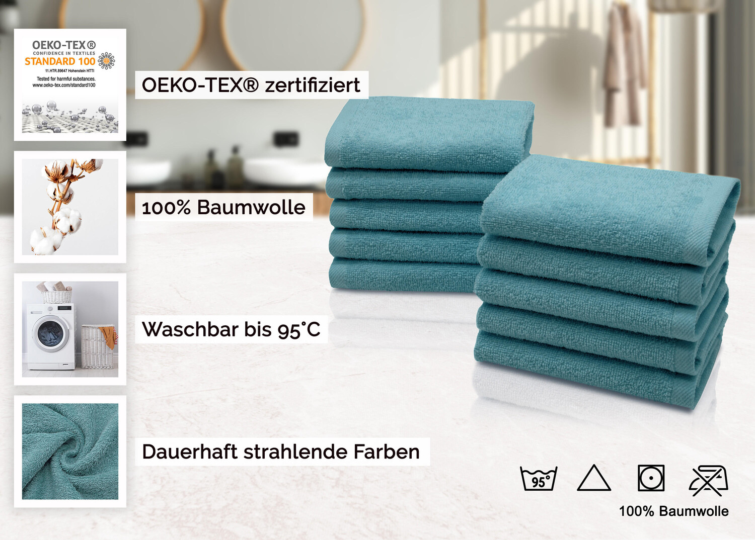 Мыльное полотенце – незаменимый помощник дома и в дороге. Эти небольшие практичные махровые полотенца идеально подходят для снятия макияжа, мытья младенцев и малышей, удаления мыла или геля для душа, а также в качестве гостевого полотенца и освежающего полотенца для вашей сумочки. Практичная вешалка облегчит хранение. Благодаря большому выбору расцветок, наверняка найдется что-то на любой вкус. Мочалки из 100% хлопка плотностью 420 г/м² сотканы в пушистую махровую ткань. Махровая ткань — особенно впитывающая и мягкая разновидность махровой ткани. Дополнительный двойной защитный шов предотвращает растирание. Благодаря окраске индантреном долговечные ткани можно стирать при температуре до 95°C и сушить в стиральной машине, не теряя при этом цвета. Практичный набор из 10 штук бензинового цвета.