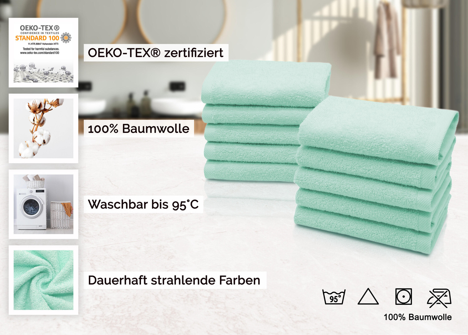 Мыльное полотенце – незаменимый помощник дома и в дороге. Эти небольшие практичные махровые полотенца идеально подходят для снятия макияжа, мытья младенцев и малышей, удаления мыла или геля для душа, а также в качестве гостевого полотенца и освежающего полотенца для вашей сумочки. Практичная вешалка облегчит хранение. Благодаря большому выбору расцветок, наверняка найдется что-то на любой вкус. Мочалки из 100% хлопка плотностью 420 г/м² сотканы в пушистую махровую ткань. Махровая ткань — особенно впитывающая и мягкая разновидность махровой ткани. Дополнительный двойной защитный шов предотвращает растирание. Благодаря окраске индантреном долговечные ткани можно стирать при температуре до 95°C и сушить в стиральной машине, не теряя при этом цвета. Практичный набор из 10 штук мятного цвета.