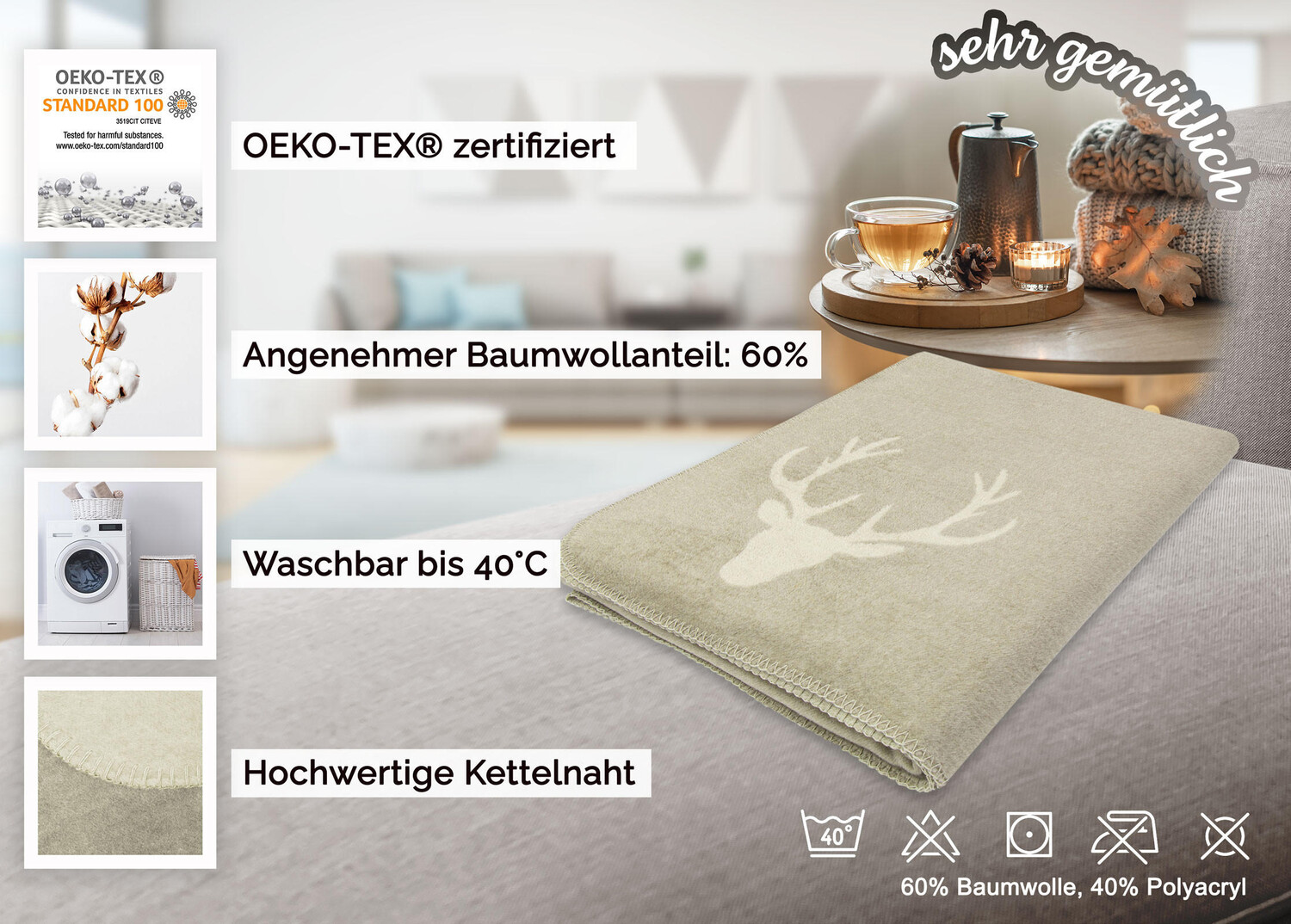 После долгого и утомительного дня устройтесь поудобнее под этим очень мягким диванным одеялом. Приятный комфортный размер 150/200 см позволяет легко проскользнуть под одеяло двум людям. Благодаря современной цветовой гамме с помощью этого пледа вы сможете создать прекрасную атмосферу и уют в своем доме. Стильная голова оленя, вытканная в нижнем углу, а также разные цвета (коричневый и кремовый) с обеих сторон привлекают внимание. Мягкое одеяло изготовлено из 60 % хлопка и 40 % полиакрила. Плотность материала составляет 420 г/м², поэтому оно мягкое и приятное на ощупь. Легкое в уходе диванное одеяло можно стирать в машине при температуре 40°C и, конечно же, можно сушить в сушильной машине. Это означает, что волокна остаются приятными и мягкими, и вы сможете наслаждаться ими долгое время.